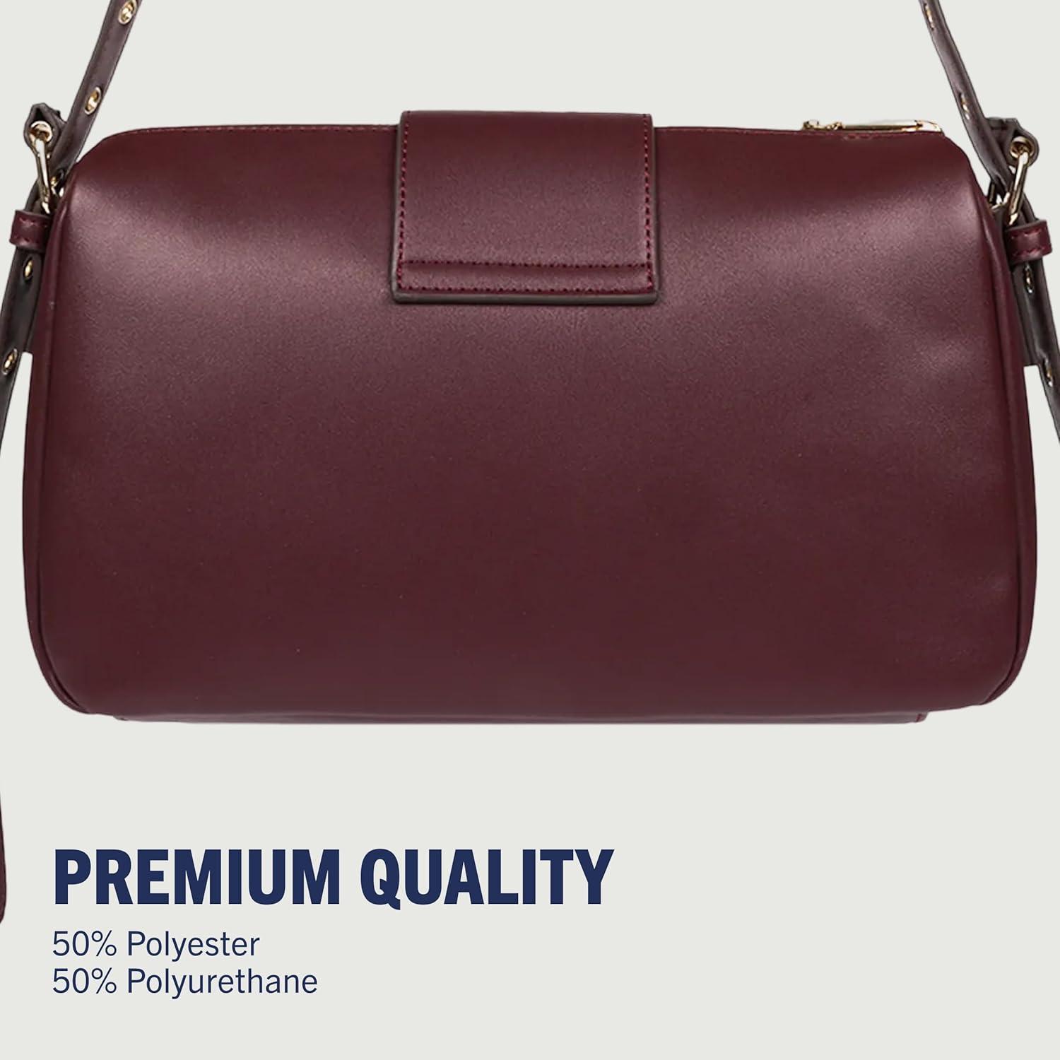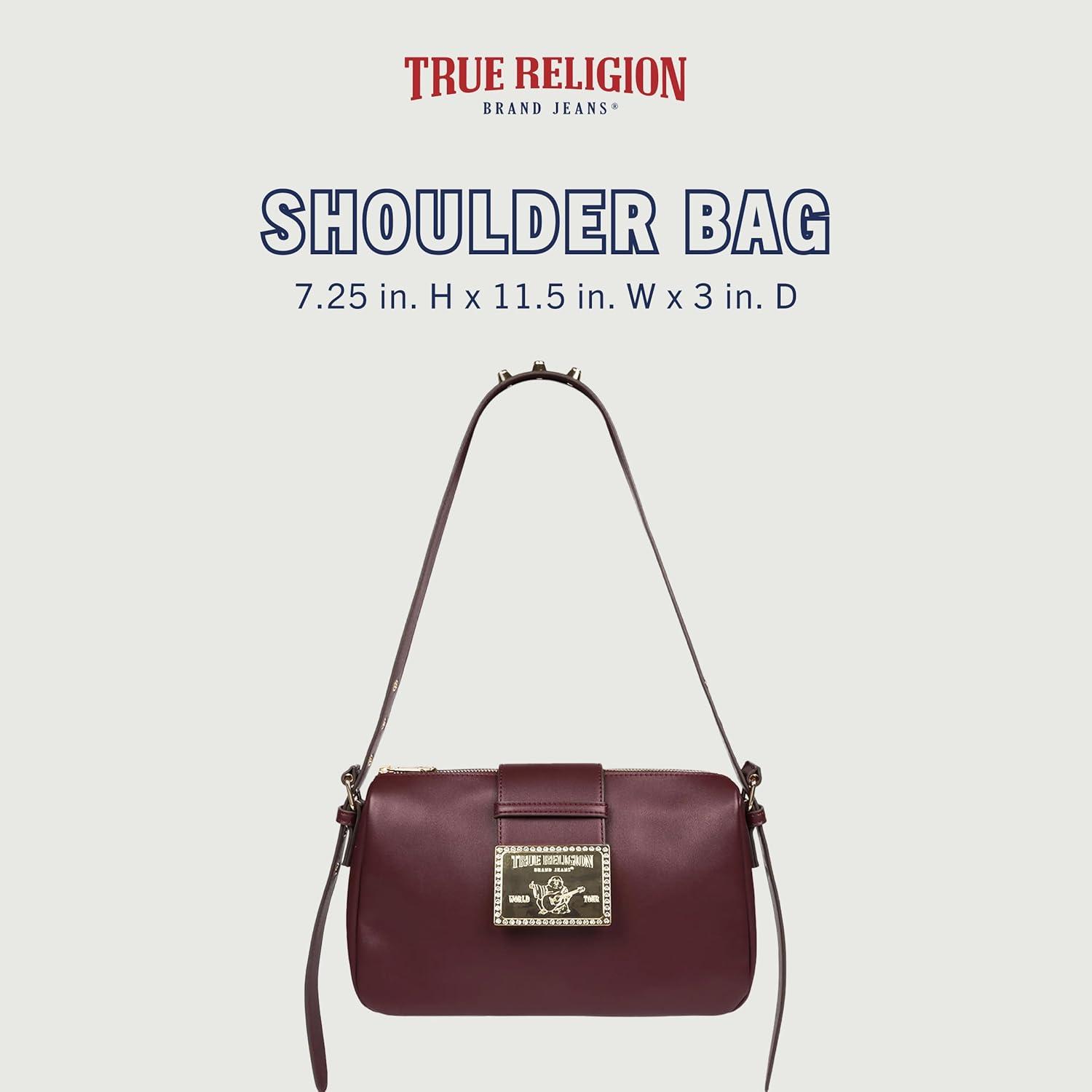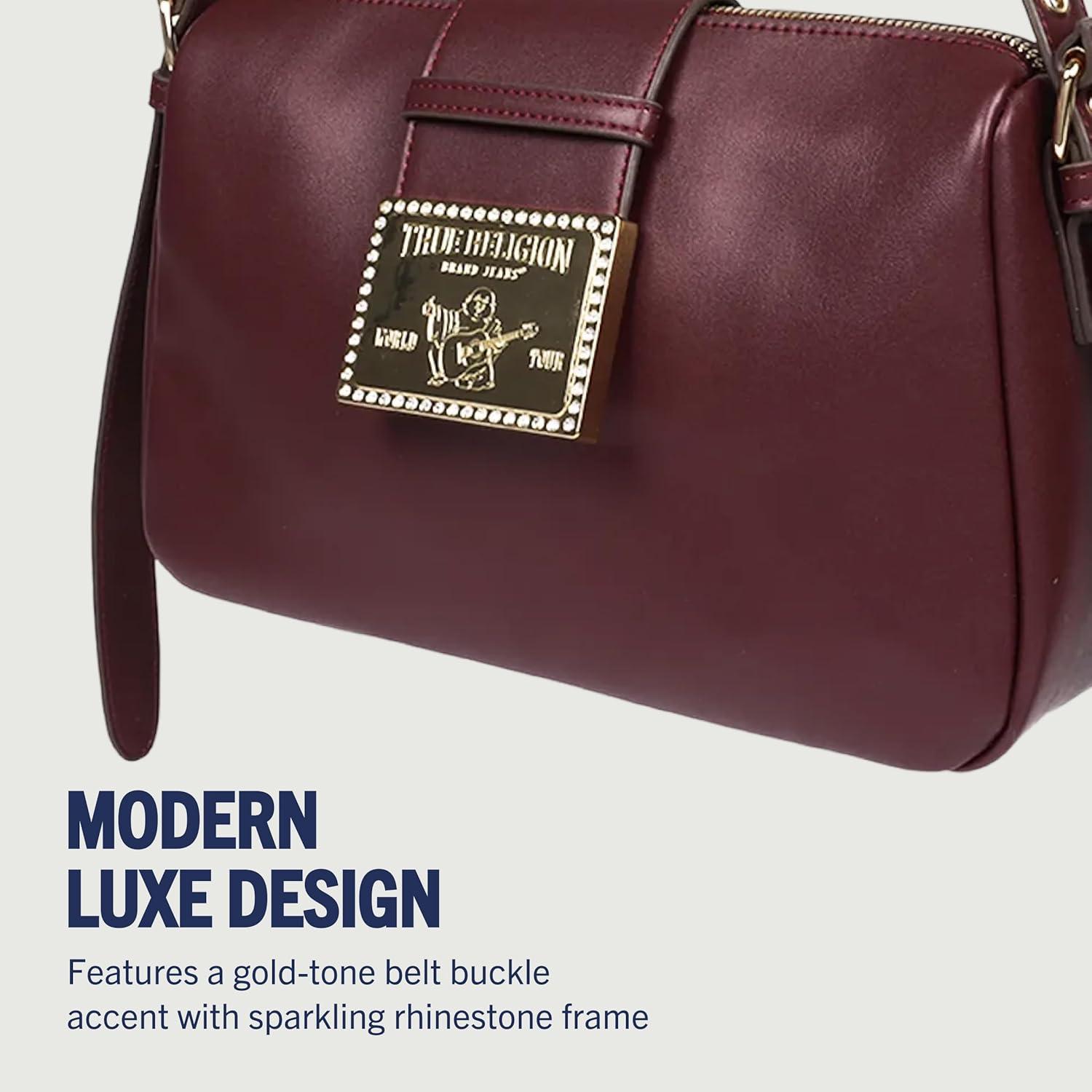 True Religion East West Crossbody Handbag, Belt Buckle Accent Shoulder Purse with Adjustable Strap and Snap Zip Closure, Gold Tone Logo, Burgundy