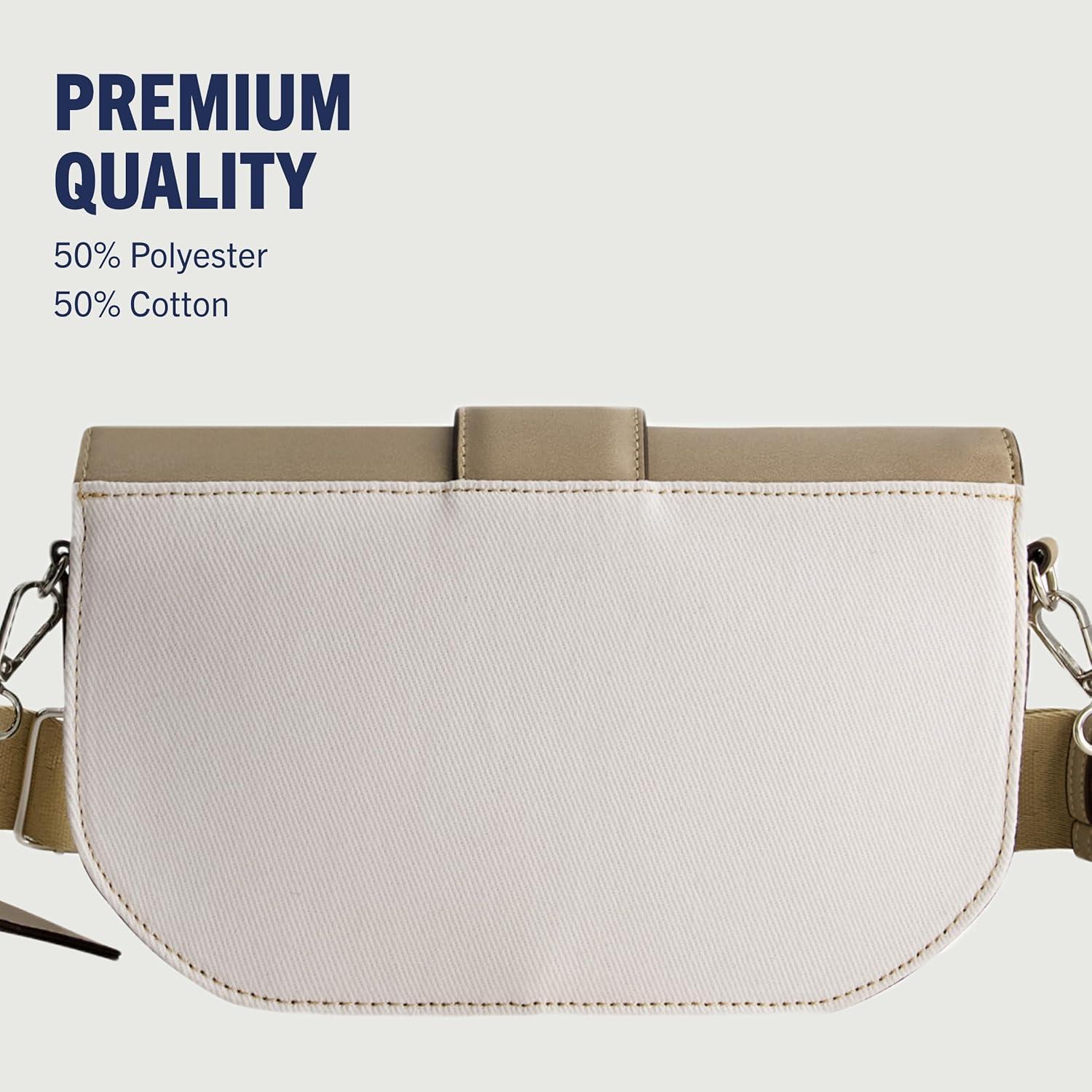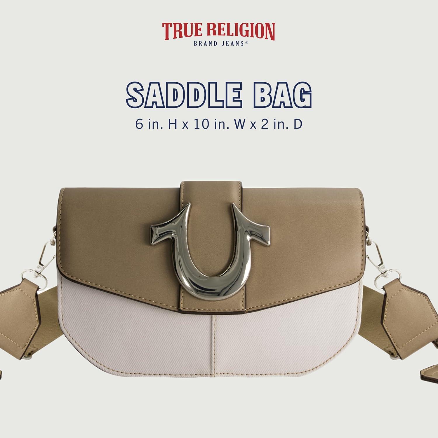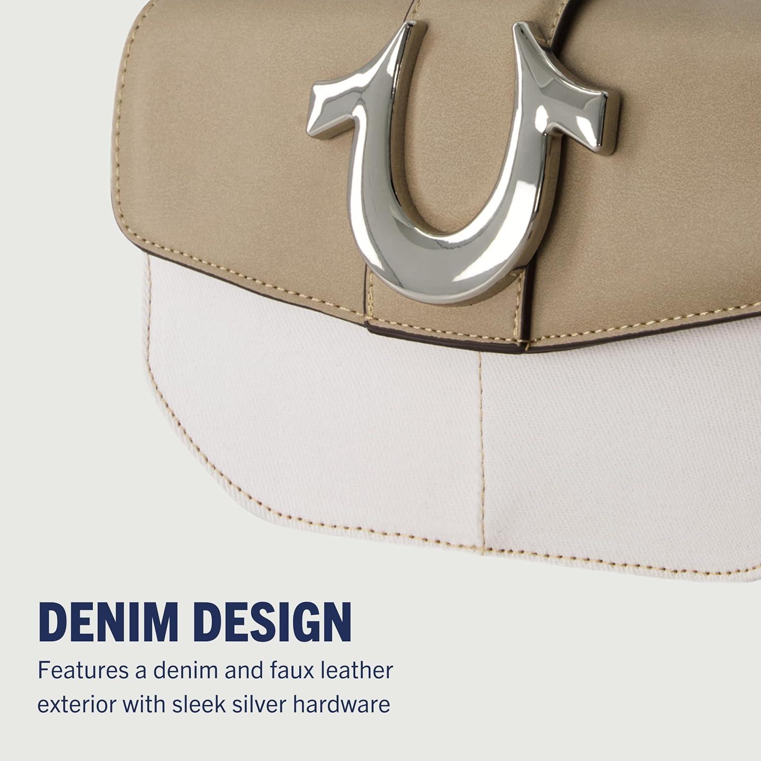 True Religion Saddle Bag, Women’s Denim and Faux Leather Crossbody Purse with Adjustable Shoulder Strap, Taupe, One Size