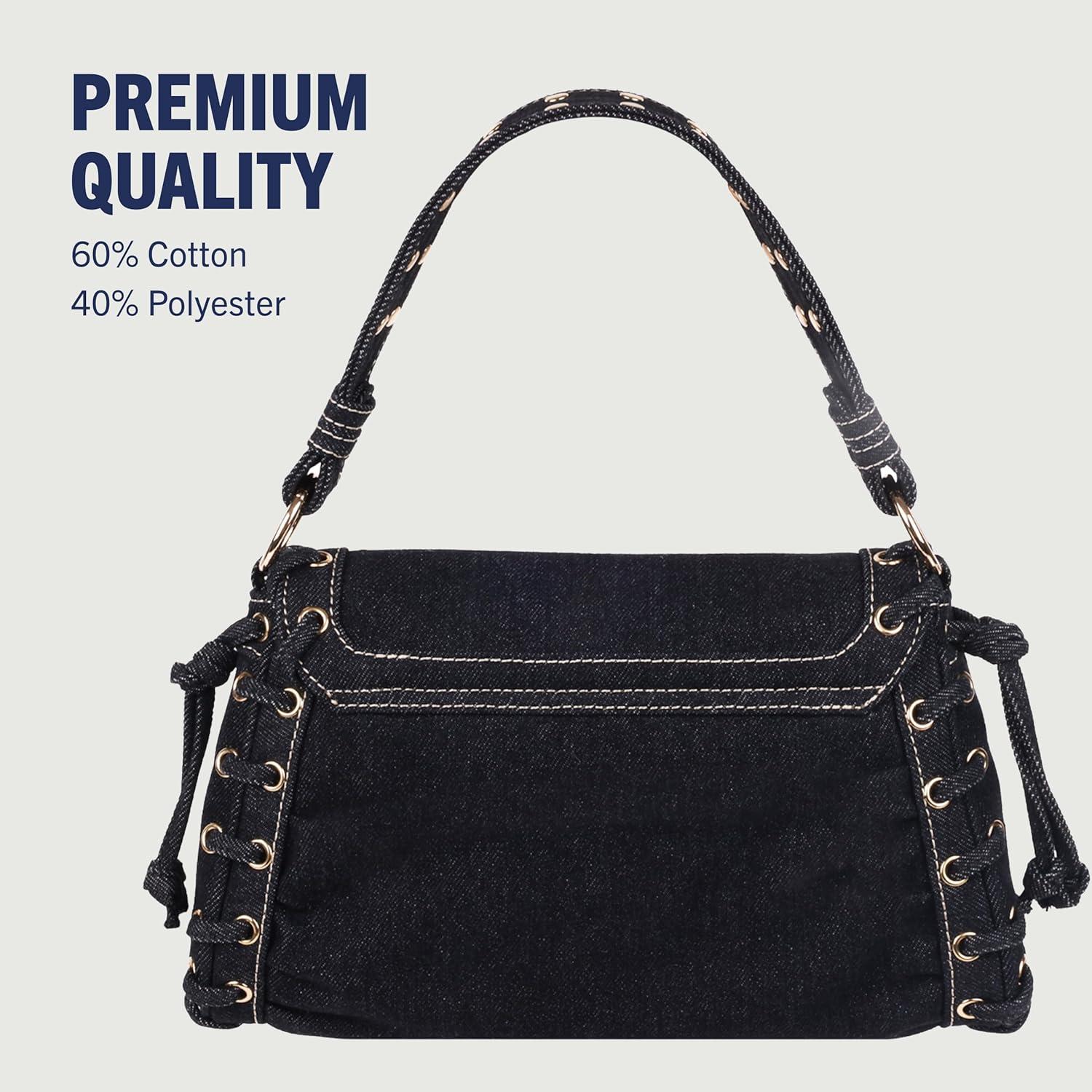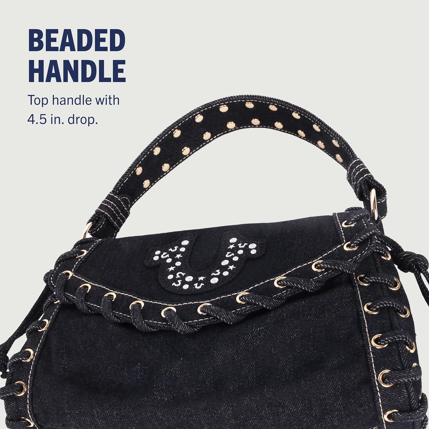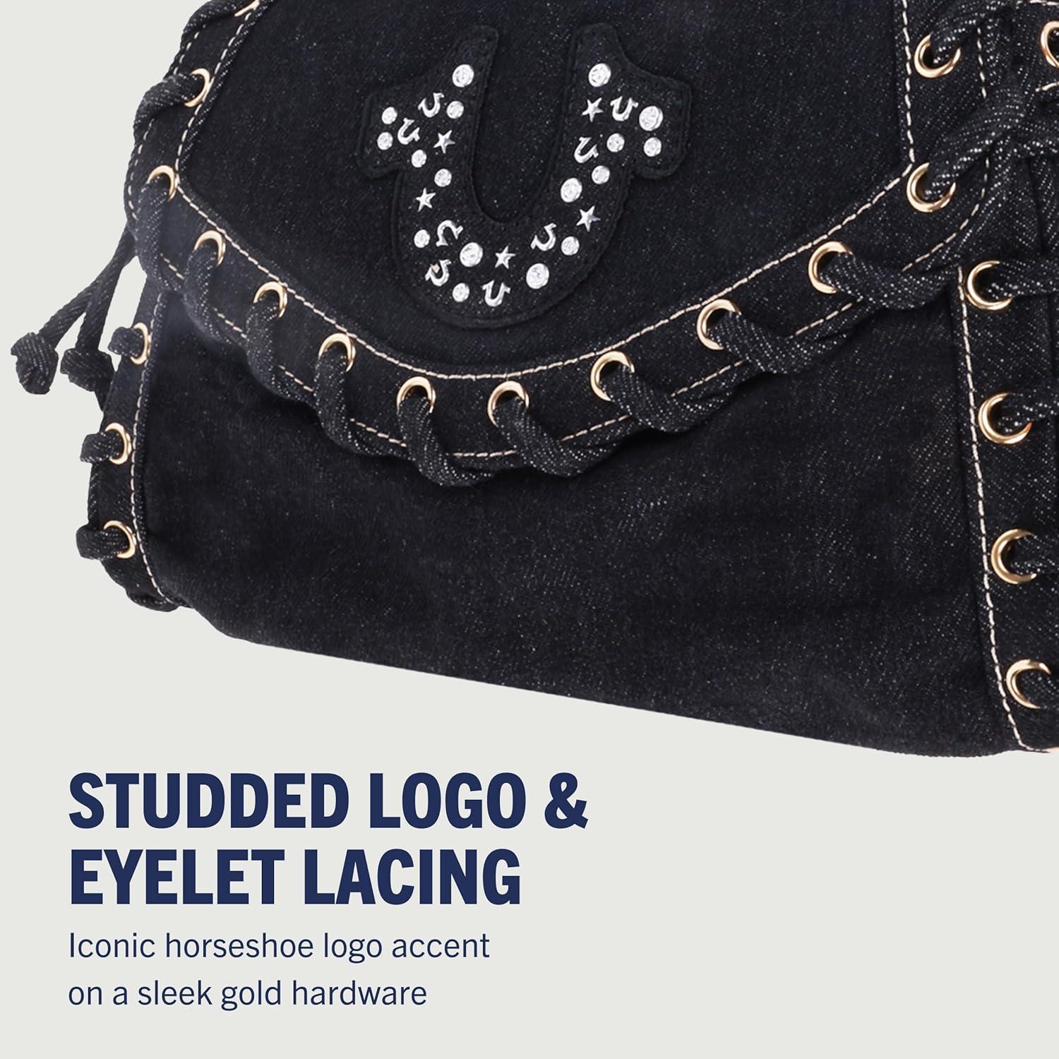True Religion Studded Horseshoe Eyelet Denim Flap Bag, Crossbody Shoulder Handbag, Black