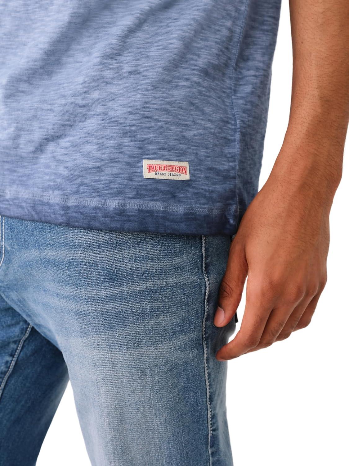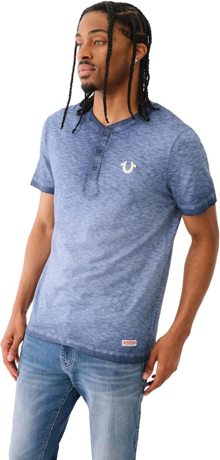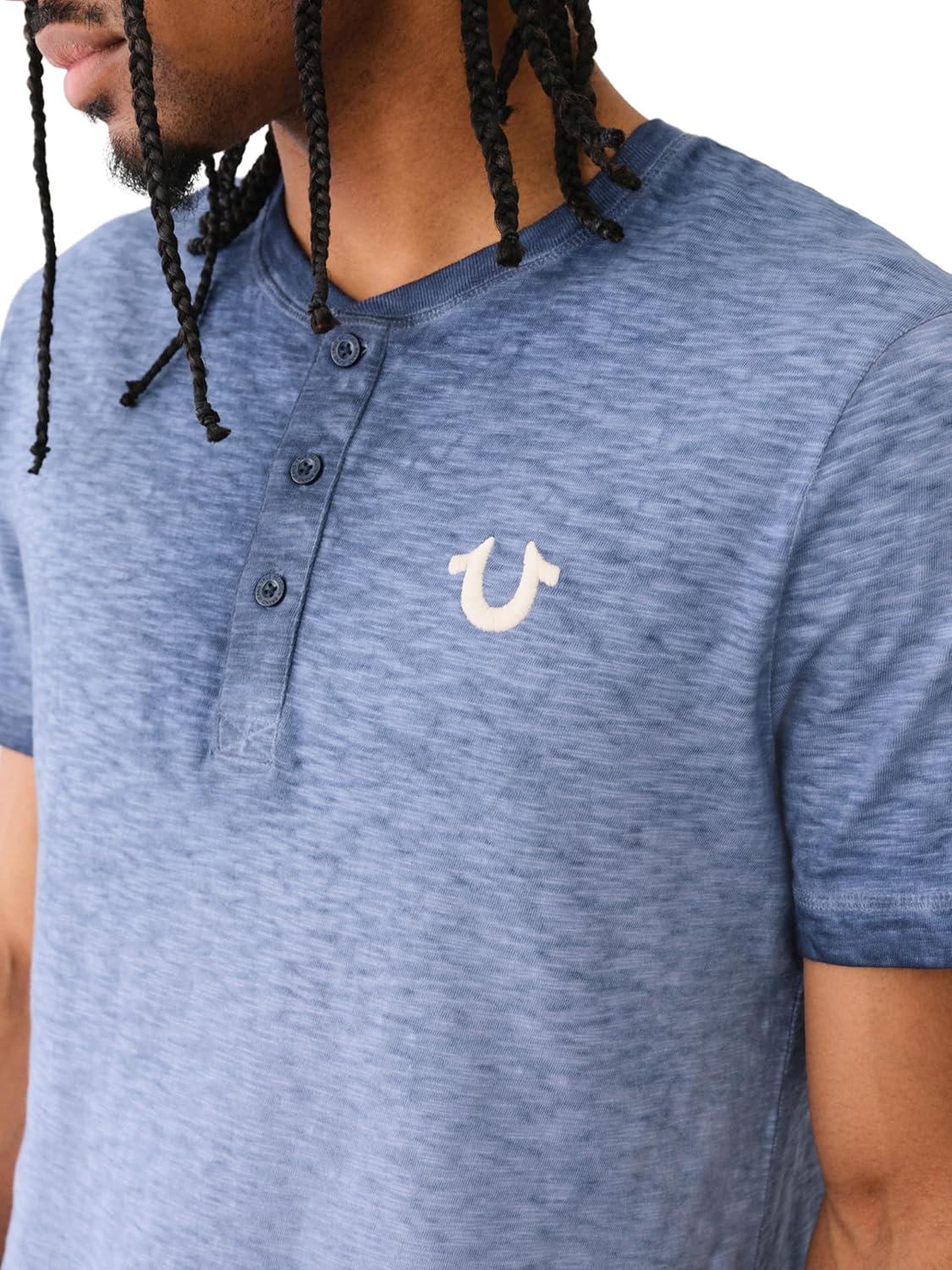True Religion mens Ss Dyed Embro Henley(Dress Blue)