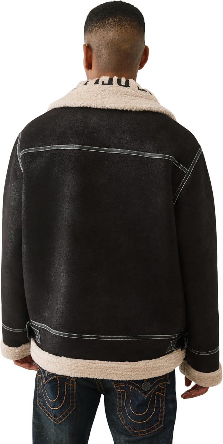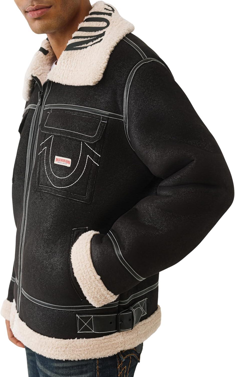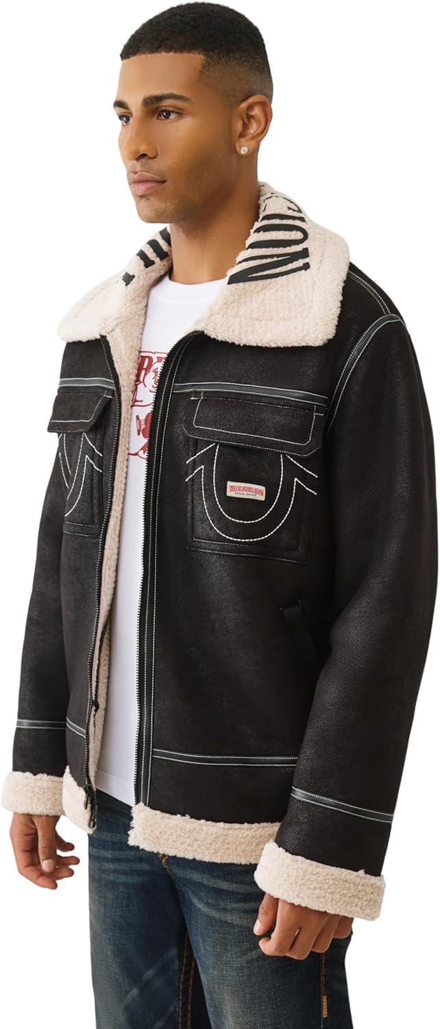 True Religion Sherpa PU Jacket for Men – Faux Leather Winter Jacket with Logo, Warm Streetwear Outerwear(Jet Black)