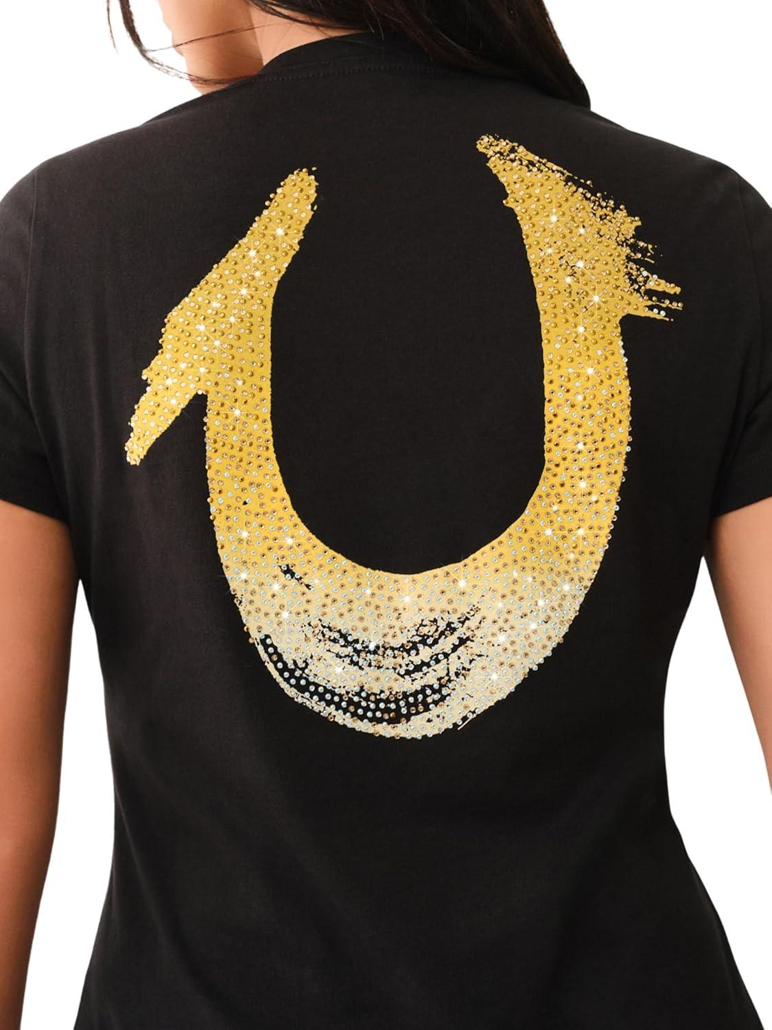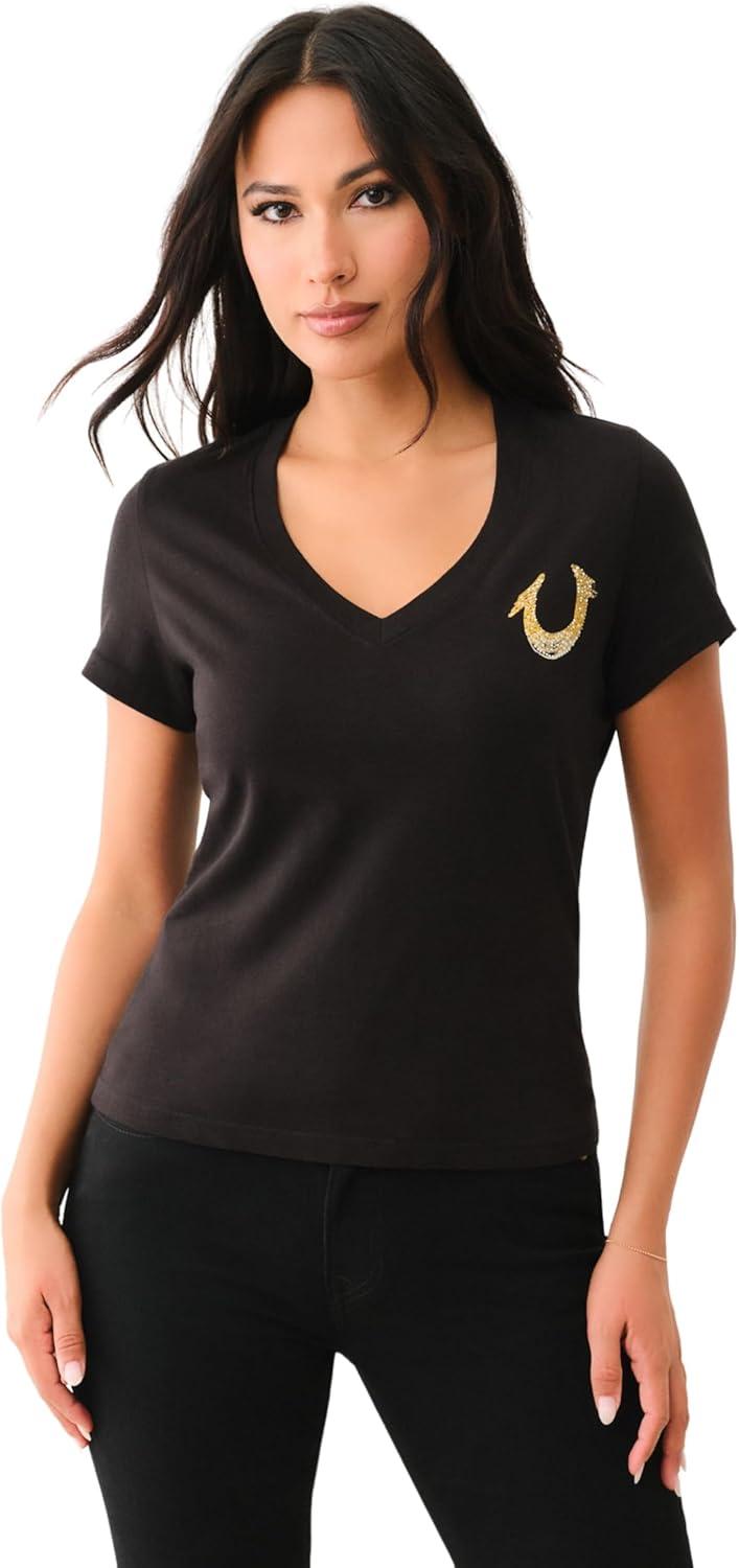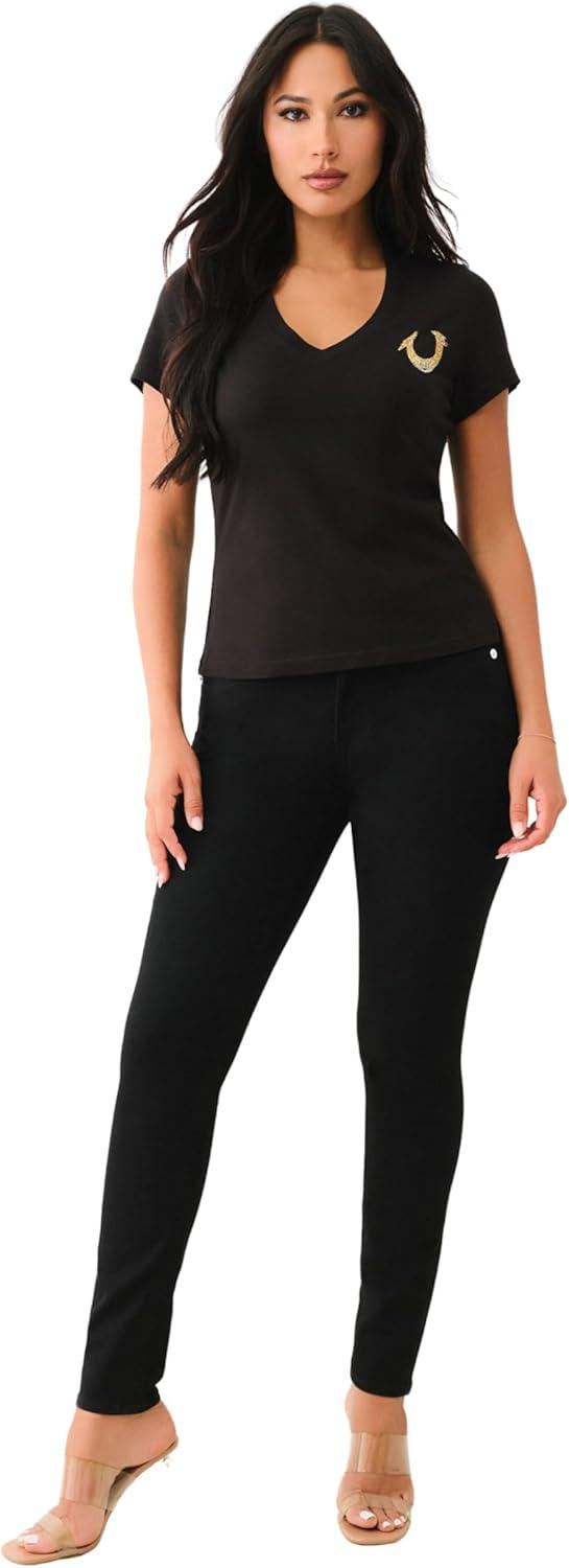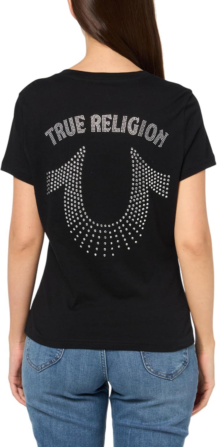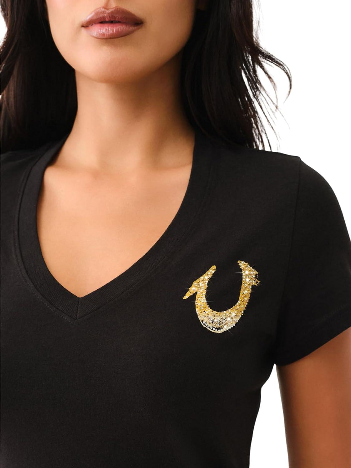 True Religion Women’s Crystal High Shine V-Neck Tee – Embellished Casual T-Shirt(Jet Black)