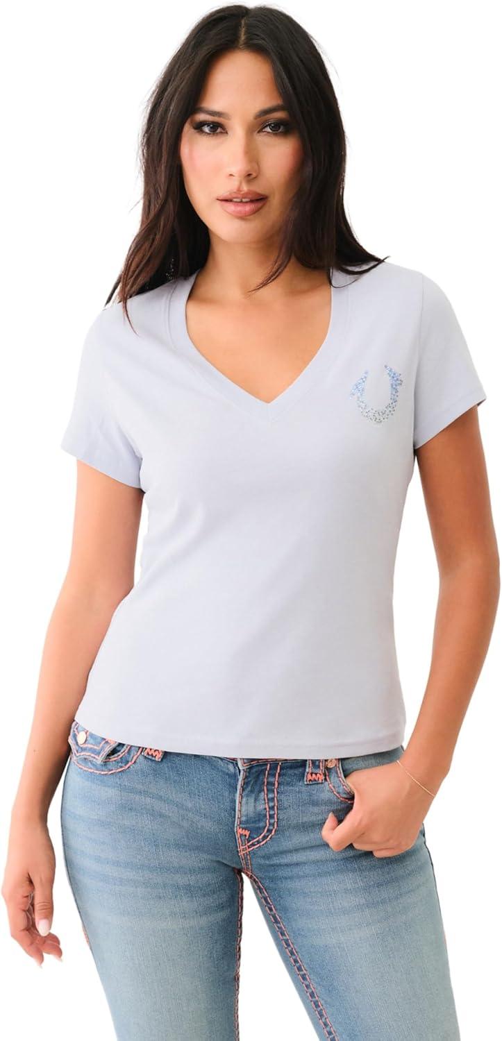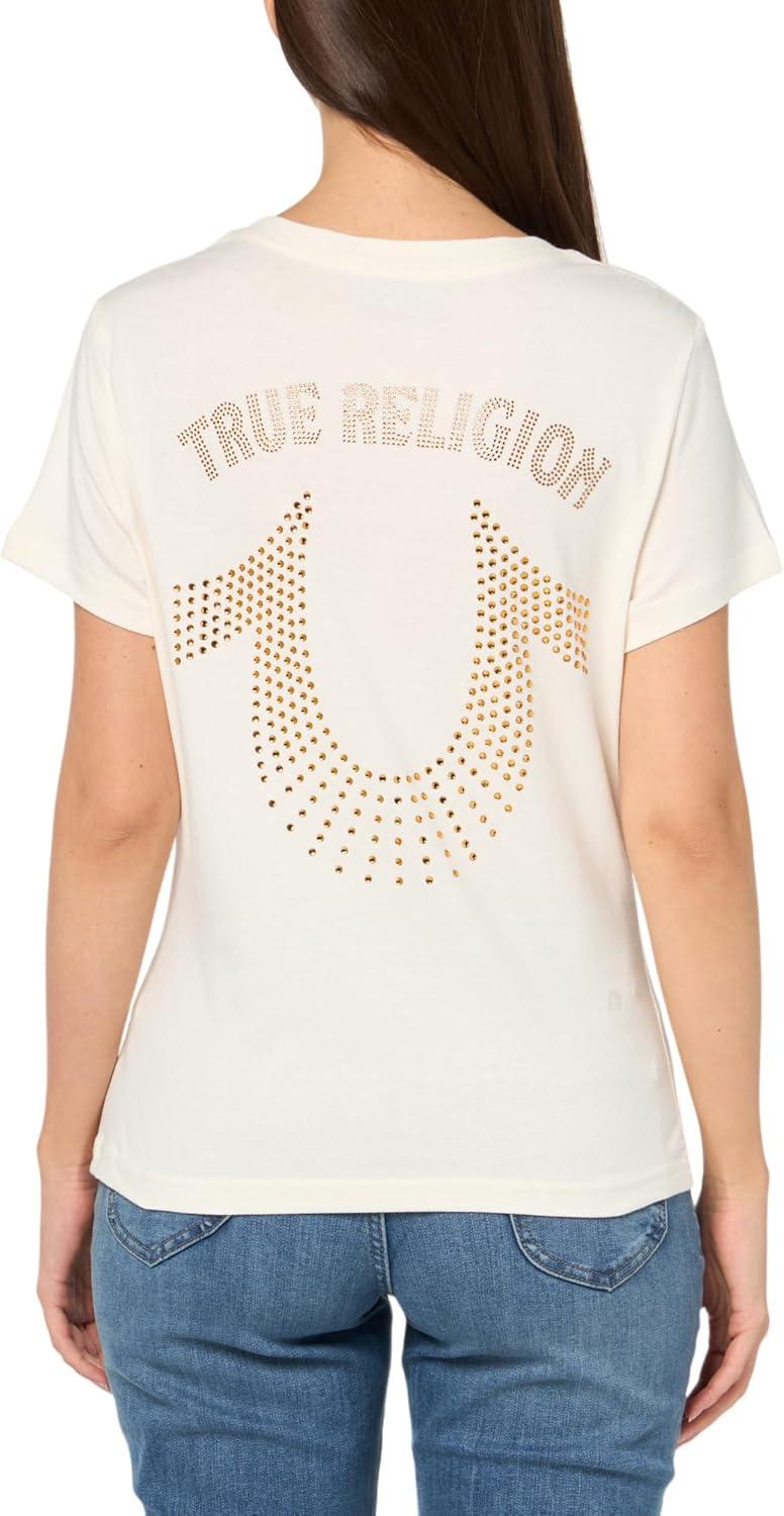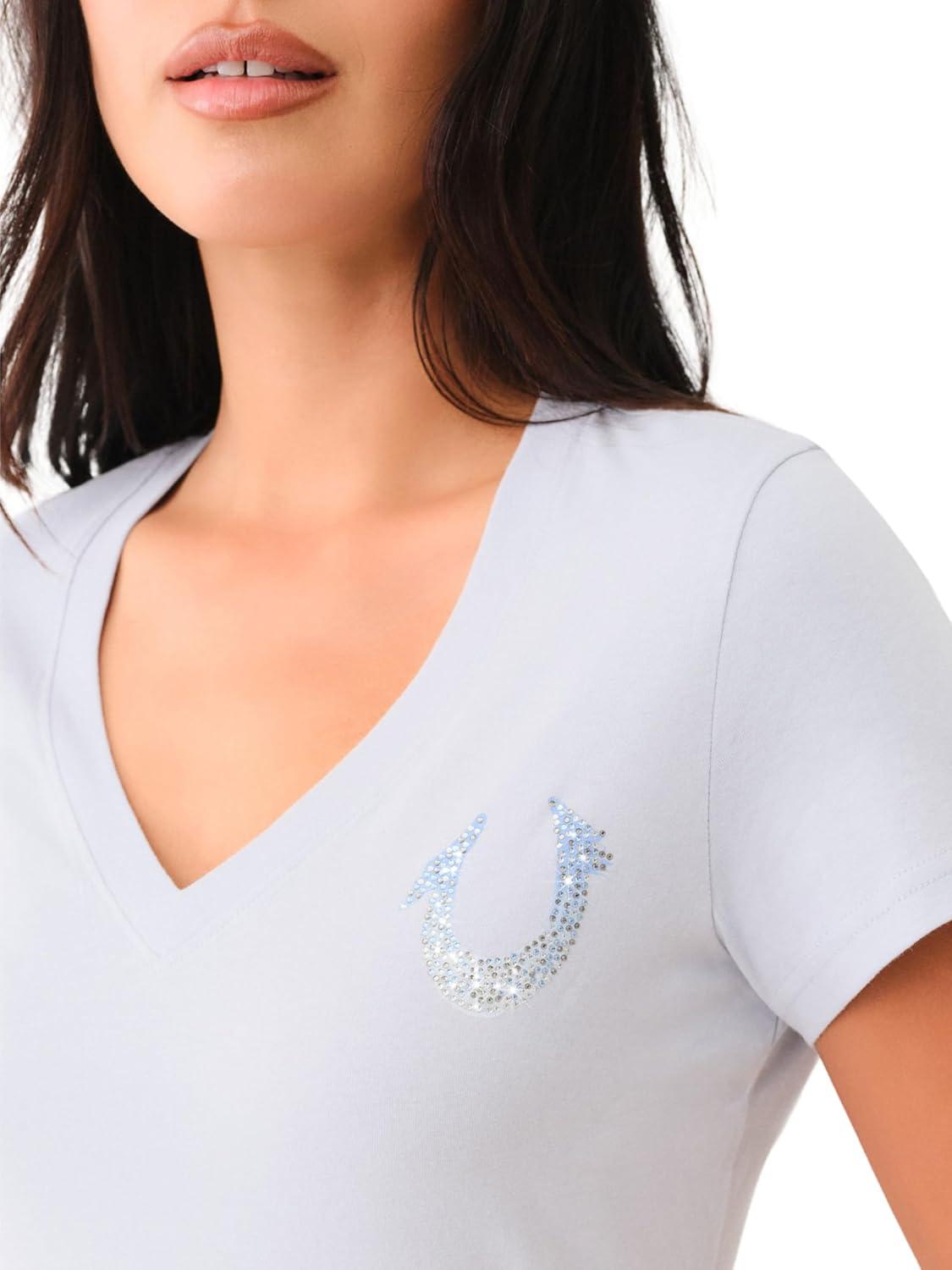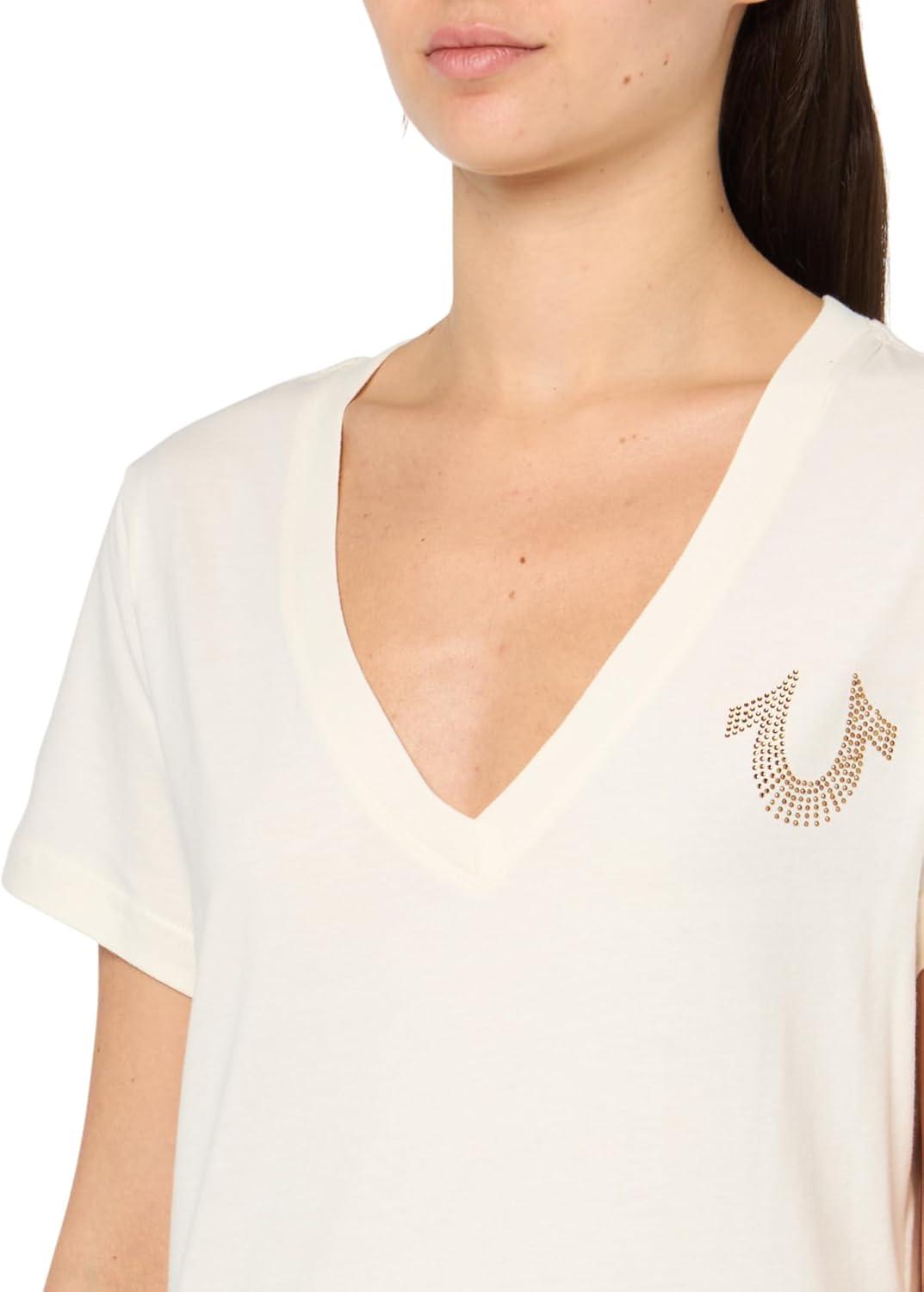 True Religion Women’s Crystal High Shine V-Neck Tee – Embellished Casual T-Shirt(Winter White)