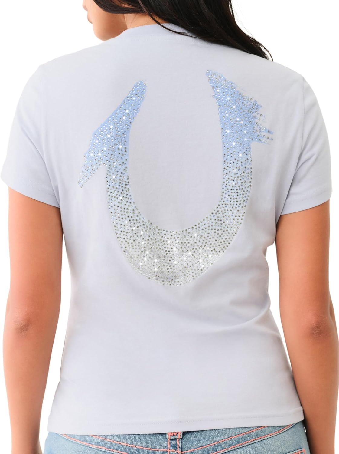 True Religion Women’s Painted Hs Ombre Crystals V Neck Tee(Zen Blue)