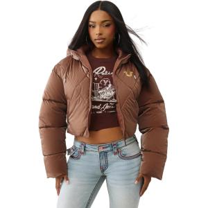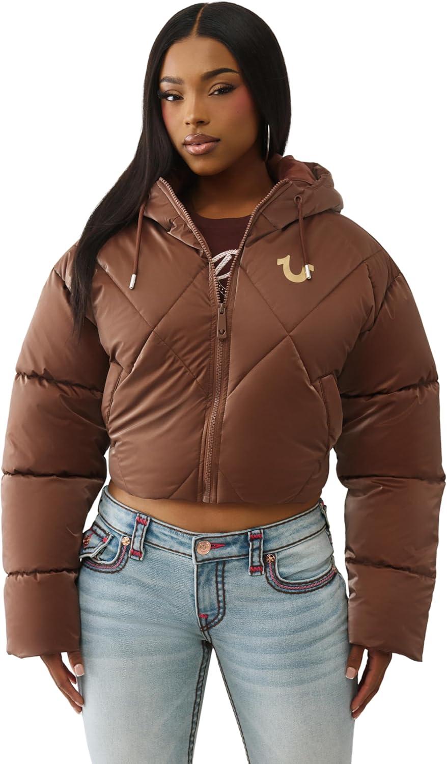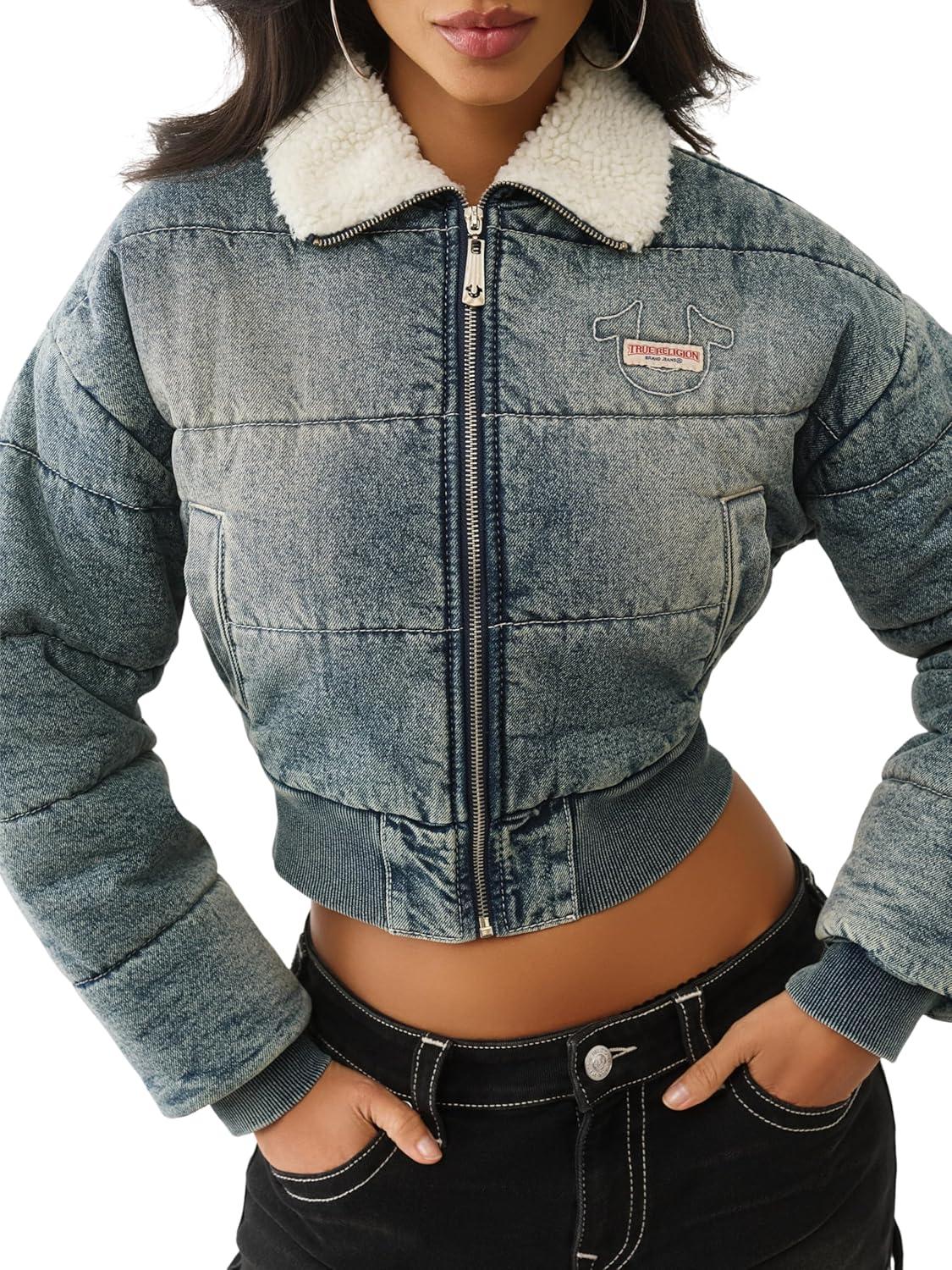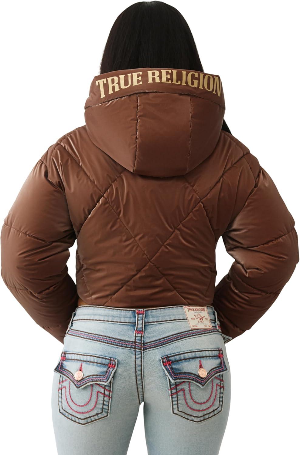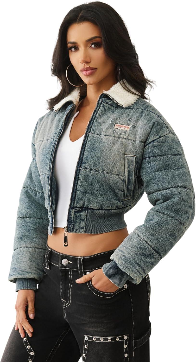 True Religion Denim Puffer Jacket for Women | Cropped Winter Jacket with Snap Hood, Logo Applique