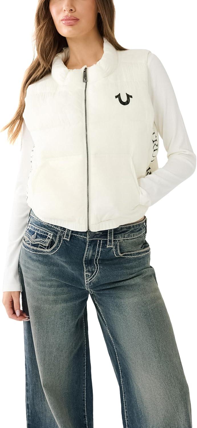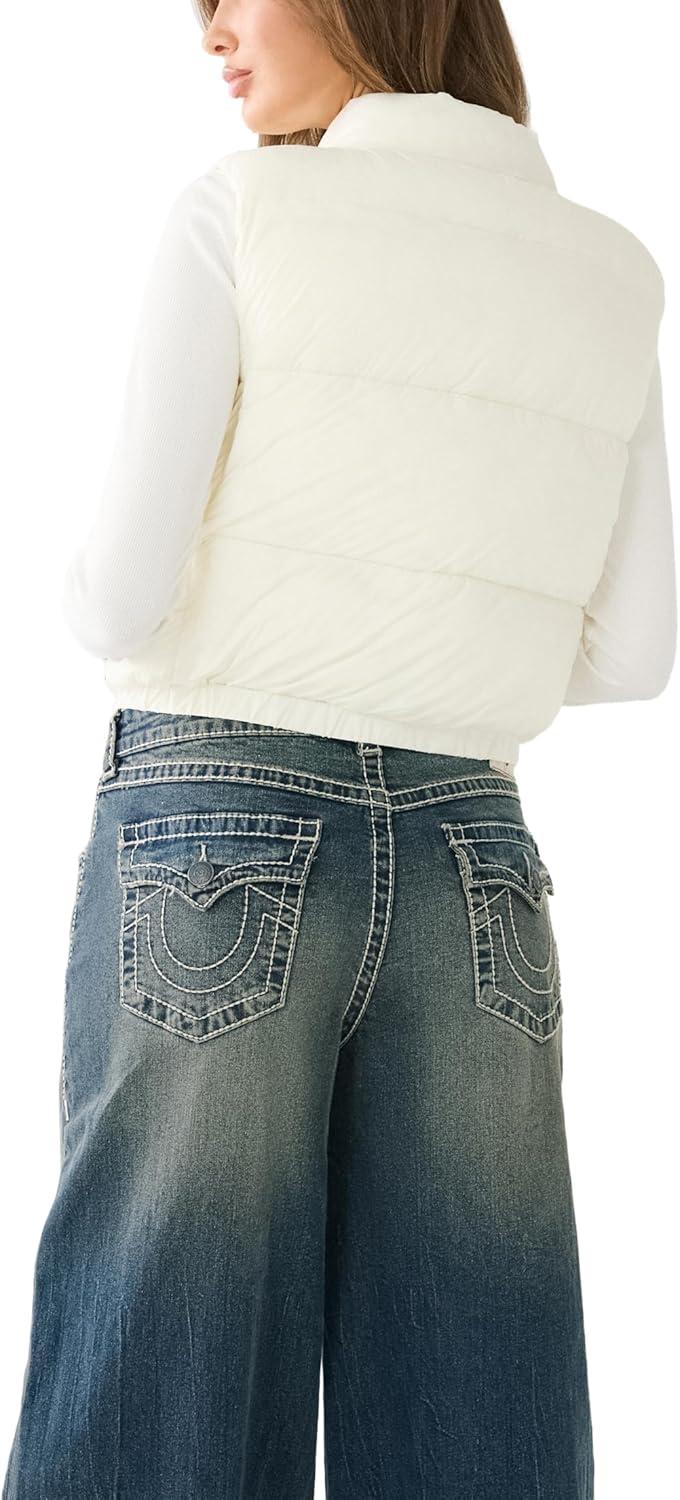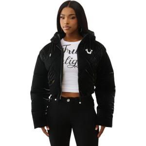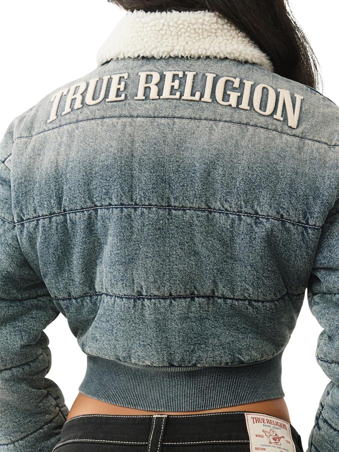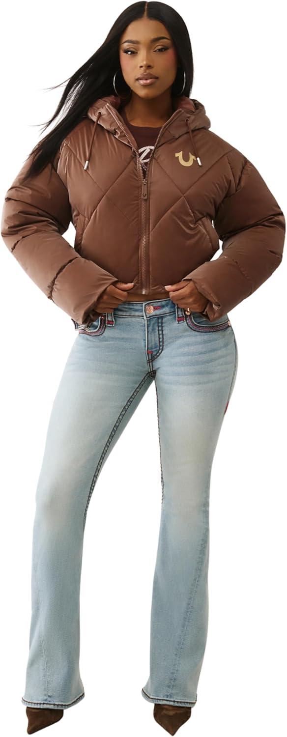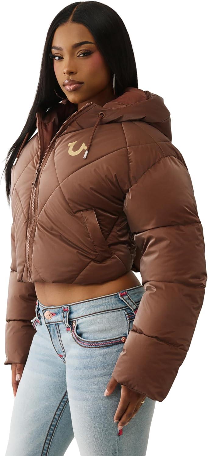 True Religion Denim Puffer Jacket for Women | Cropped Winter Jacket with Snap Hood, Logo Applique