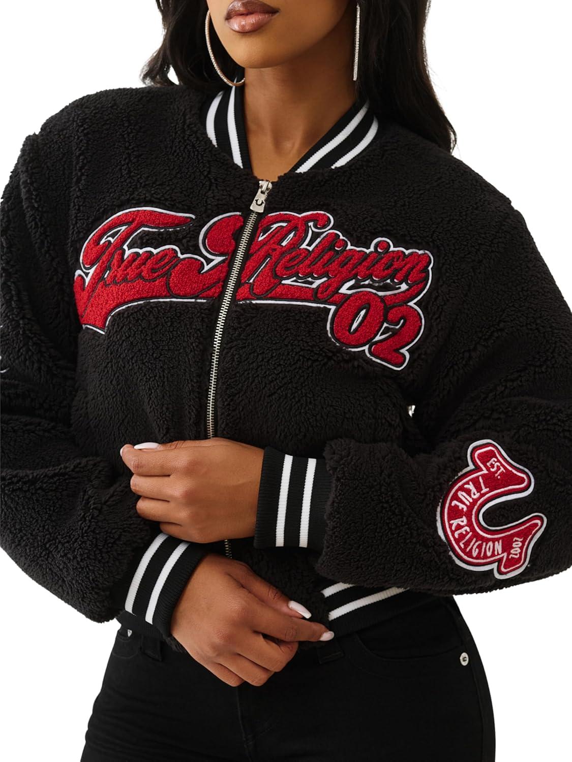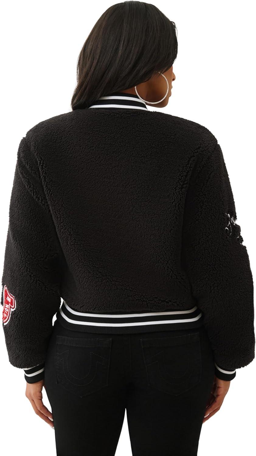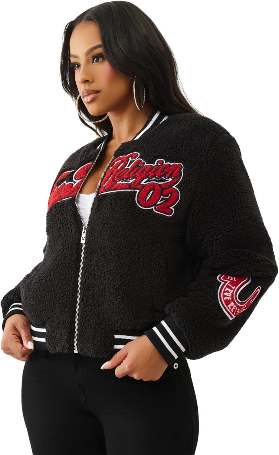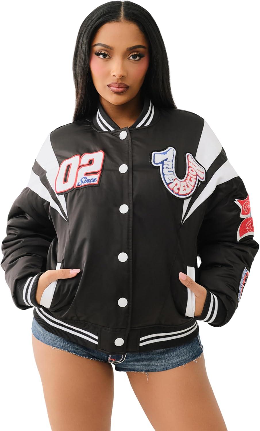 True Religion Varsity Chenille Bomber Women’s Jacket | Winter Coat for Women with Bold Patches & Snap Buttons(Jet Black)