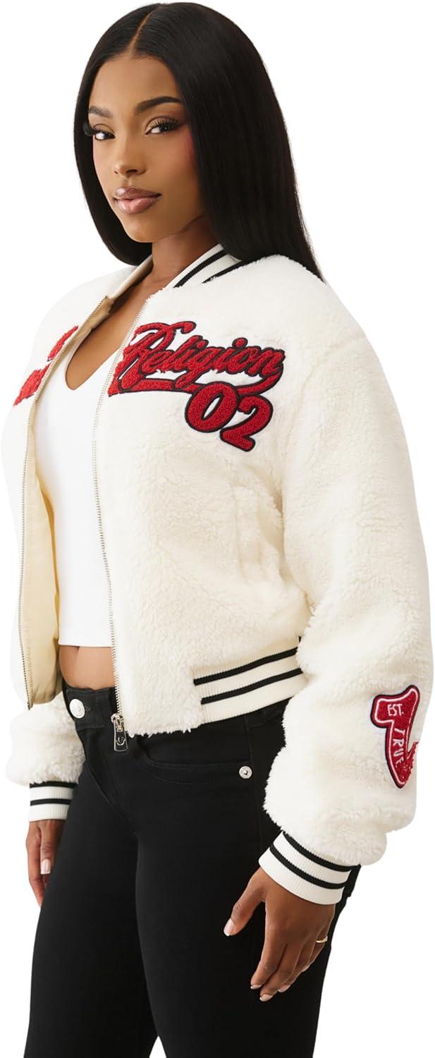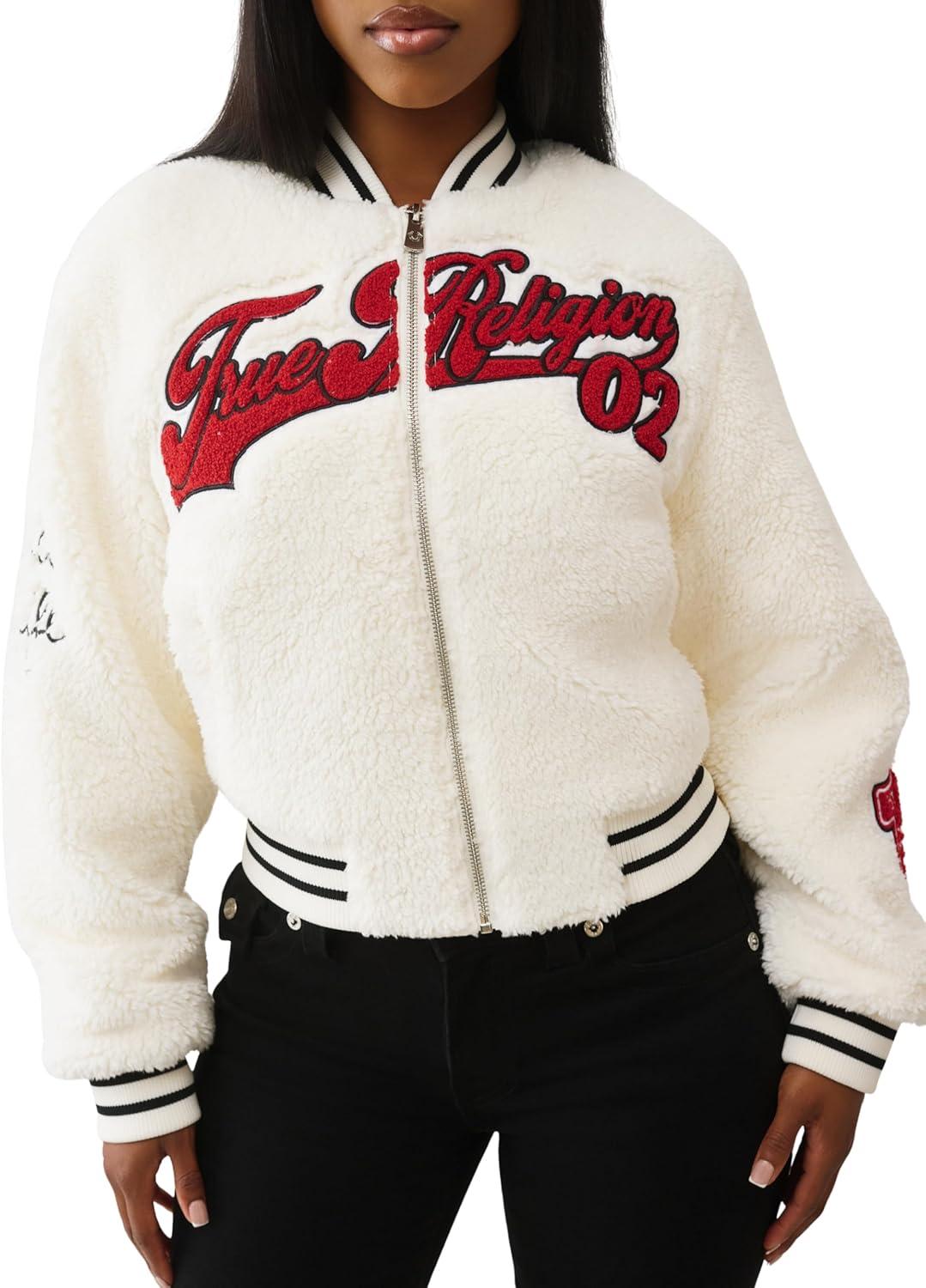 True Religion Varsity Chenille Bomber Women’s Jacket | Winter Coat for Women with Bold Patches & Snap Buttons(Winter White)