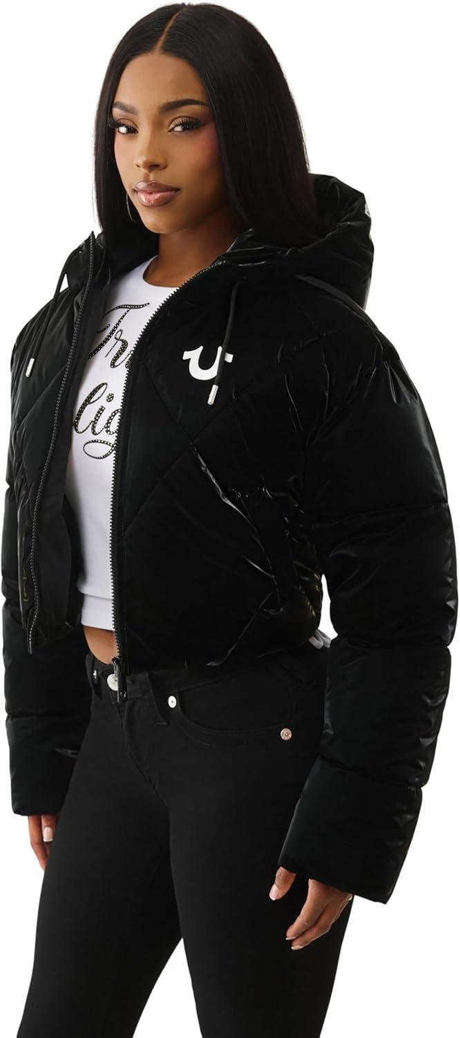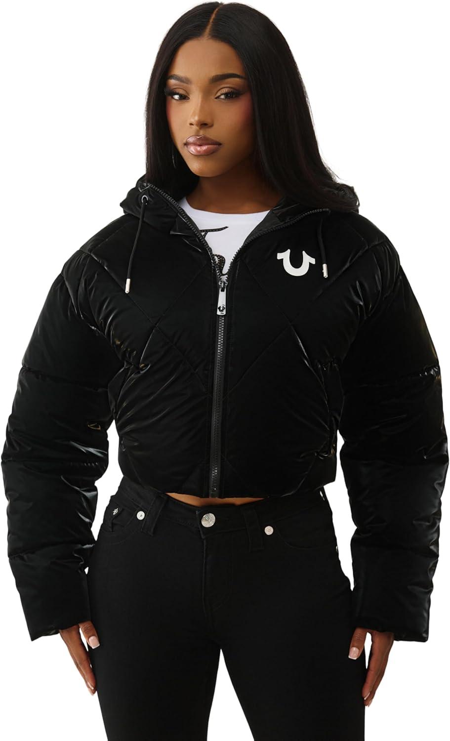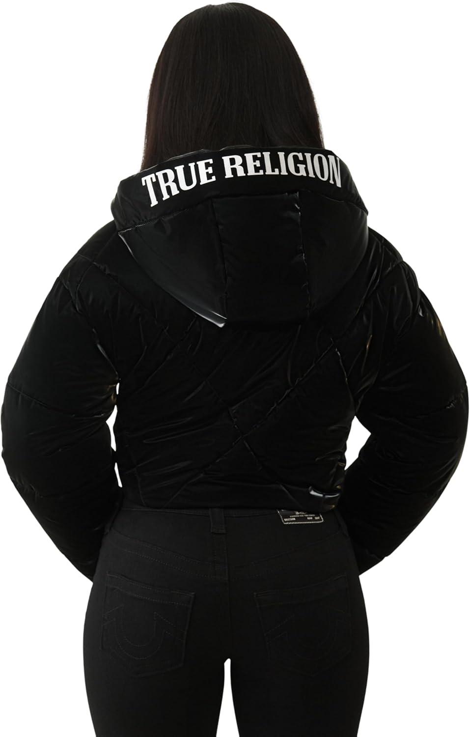 True Religion Women’s High Shine Foil Hooded Puffer – Lightweight & Comfortable Winter Jacket(Jet Black)