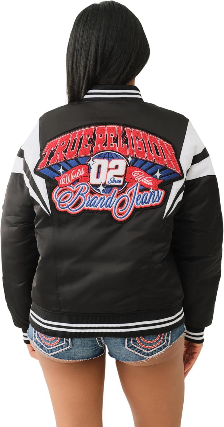 True Religion Women’s TR Satin Oversized Varsity Bomber Jacket – Jet Black | Zip-Up Bomber with Ribbed Cuffs(Jet Black)