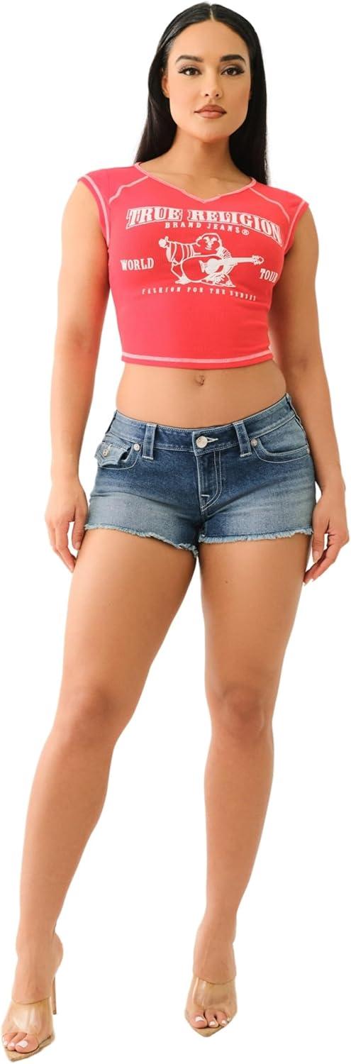 True Religion Women’s Wing HS Joey LR Cut Off Flap Big T Shorts – Gahan | Denim Shorts with Flap Pockets(Gahan)