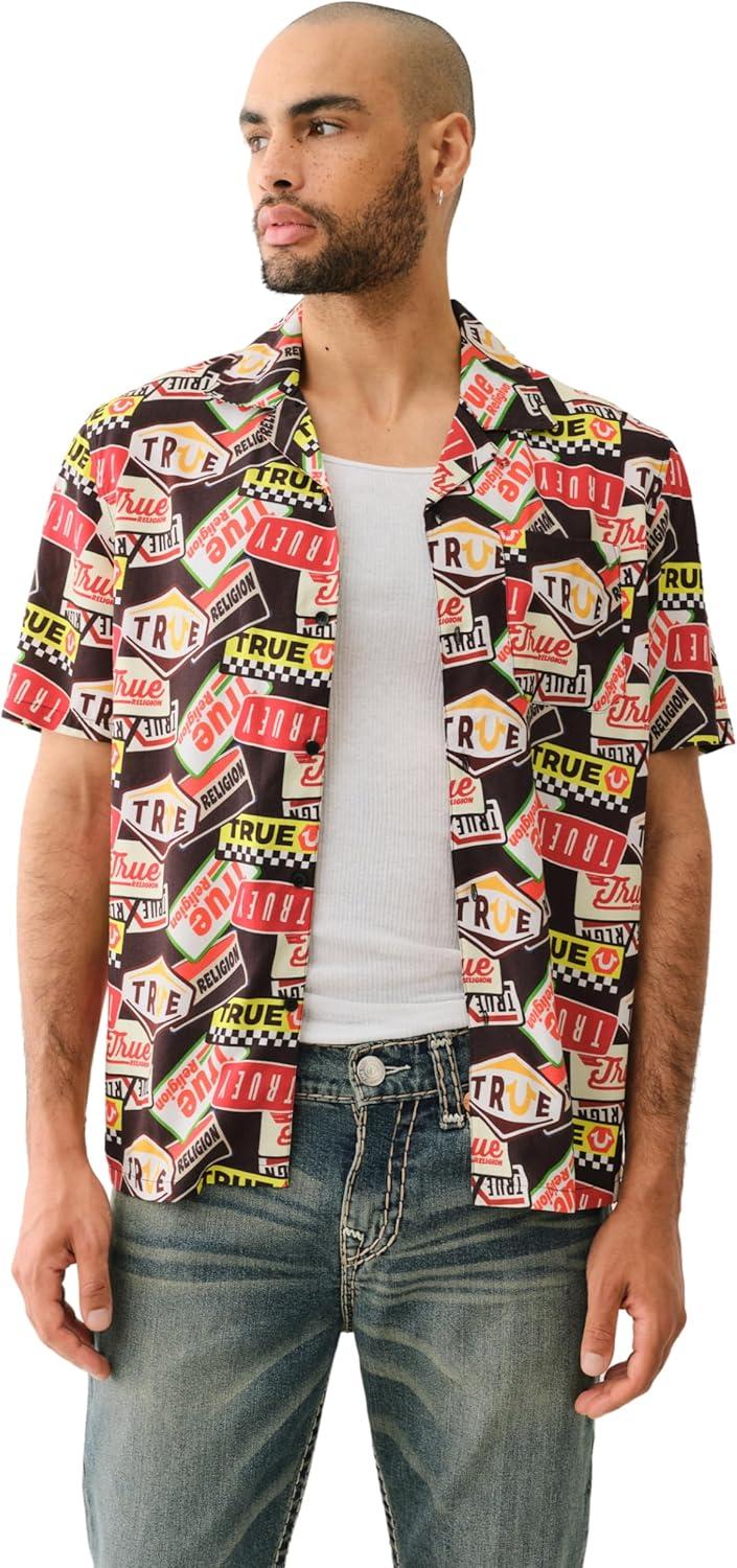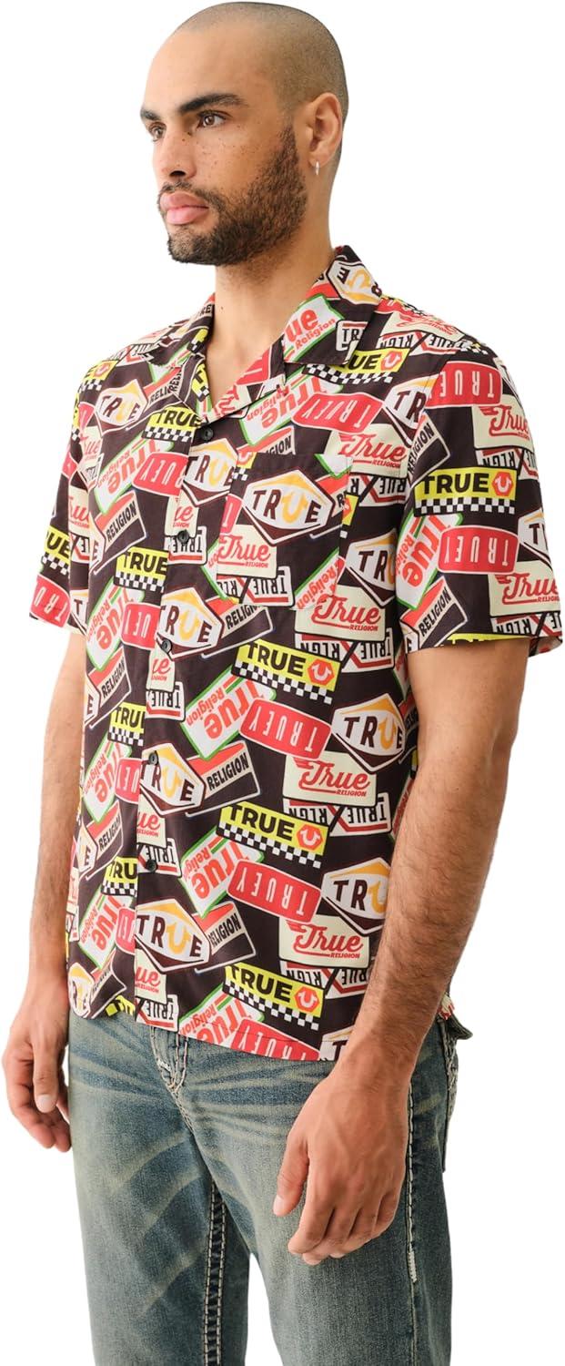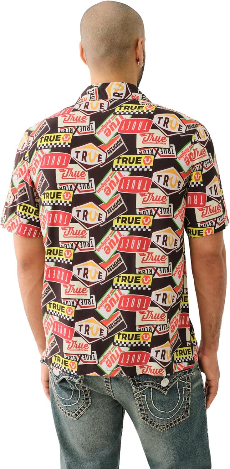 True Religion Men’s SS Camp Shirt All Over Print – Black/Yellow/White | Short Sleeve Rayon Viscose Button-Up(Blk Ylow Wht)