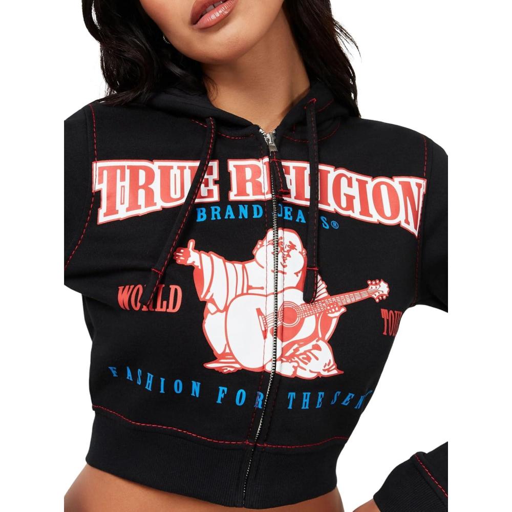 True Religion Anniversary Big T Shrunken Zip Hoodie for Women(Jet Black)