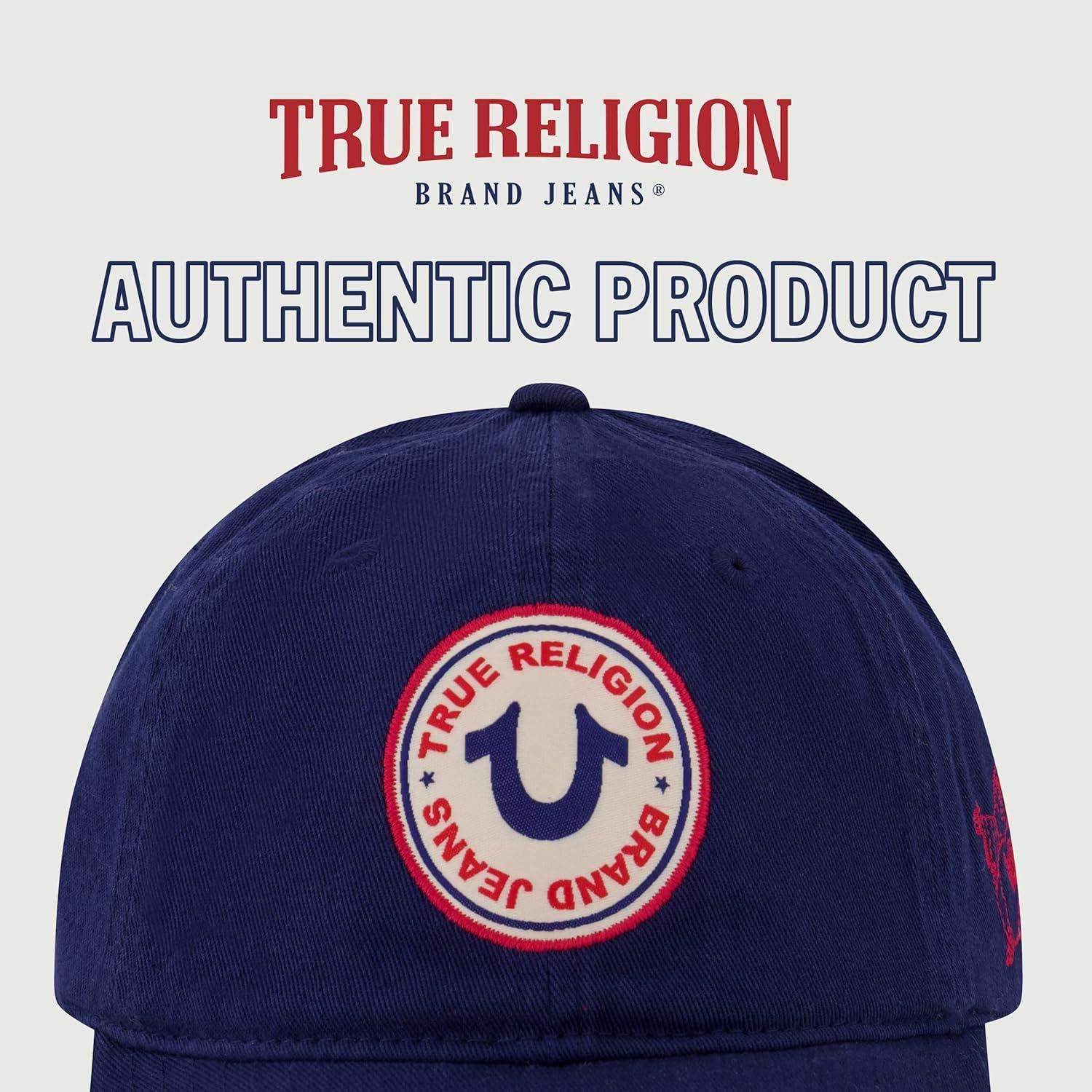 Wear fashionable apparel befitting the True Religion brand with the True Religion hook and loop baseball hat. Composed of lightweight and durable cotton twill material, this distinctive baseball hat is adorned with an eye-catching horseshoe logo on a round woven patch, and allows for instant comfort when worn. The hook and loop closure strap allows for easy adjustment for a wide variety of boy and girl head sizes, and the ball cap features a curved hat brim with stitching to keep the Sun's UV rays out of your eyes. These hats are officially licensed True Religion products, ensuring that you are receiving quality True Religion merch. Recommended for hand washing only.