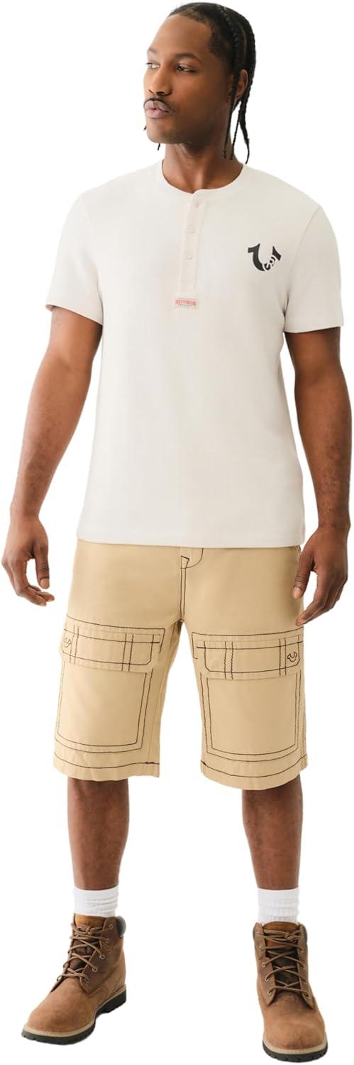 True Religion Men's Big T Vinny Cargo Short. Designed with a slim fit, these cargo shorts offer a sleek and modern silhouette, perfect for a stylish, everyday look. The flap pockets add both functionality and a distinctive edge, allowing you to store your essentials while showcasing an iconic True Religion style.