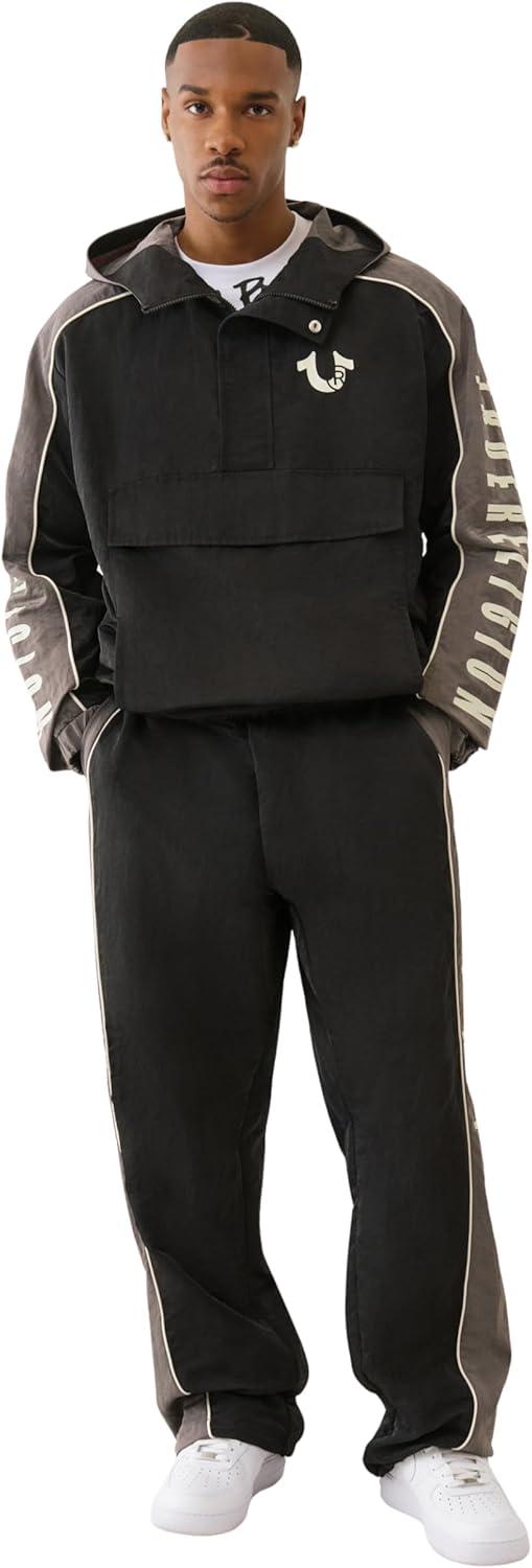 True Religion Men's Colorblock Anorak Jacket. This lightweight pullover jacket features bold colorblock design for a modern look, along with a convenient hood and adjustable drawstring for customizable coverage. Crafted from durable, wind-resistant fabric, it’s perfect for layering on breezy days. The front kangaroo pocket adds practicality, while elastic cuffs keep the elements out.