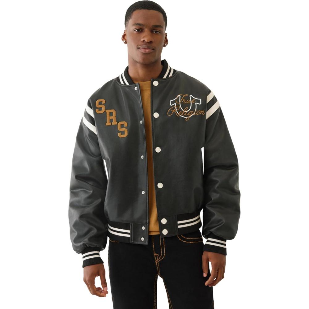 True Religion Men's Retro PU Varsity Jacket. Featuring a classic letterman silhouette made from premium faux leather (PU), this jacket blends retro vibes with modern streetwear energy. Designed with logo patches, striped ribbed trim, and a snap-button front, it's a statement piece that delivers timeless varsity appeal with a True Religion edge. Whether layered over a tee or hoodie, this jacket brings instant cool to any look.