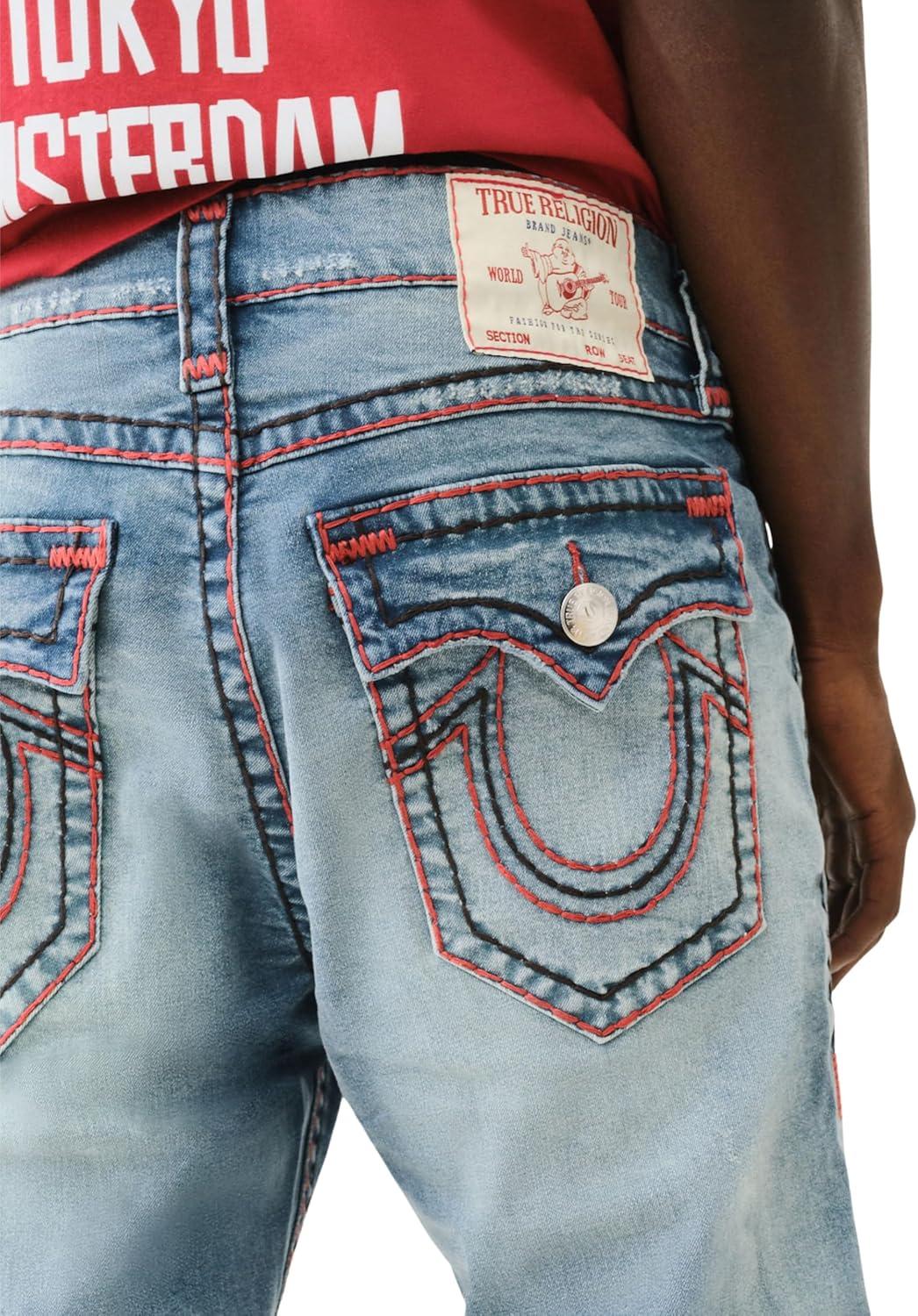 True Religion Men's Ricky Jeans, featuring the iconic Triple Logo Super T stitching and functional design elements. These jeans are distinguished by their bold Triple Logo Super T stitch, offering a unique and eye-catching detail that exemplifies True Religion's renowned craftsmanship.