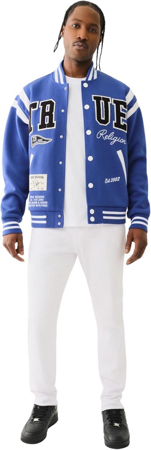 The contrasting ribbed collar, cuffs, and hem add a timeless athletic touch, while the True Religion logo detailing enhances its signature look. With snap-button closure, this jacket is easy to wear and style, making it a versatile addition to any wardrobe. Whether you're heading out for a casual day or looking to elevate your streetwear game, this varsity jacket delivers effortless style.