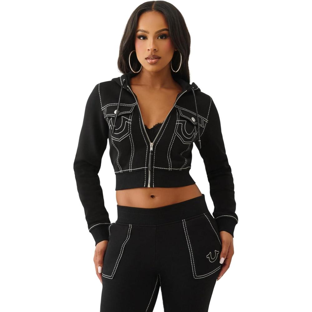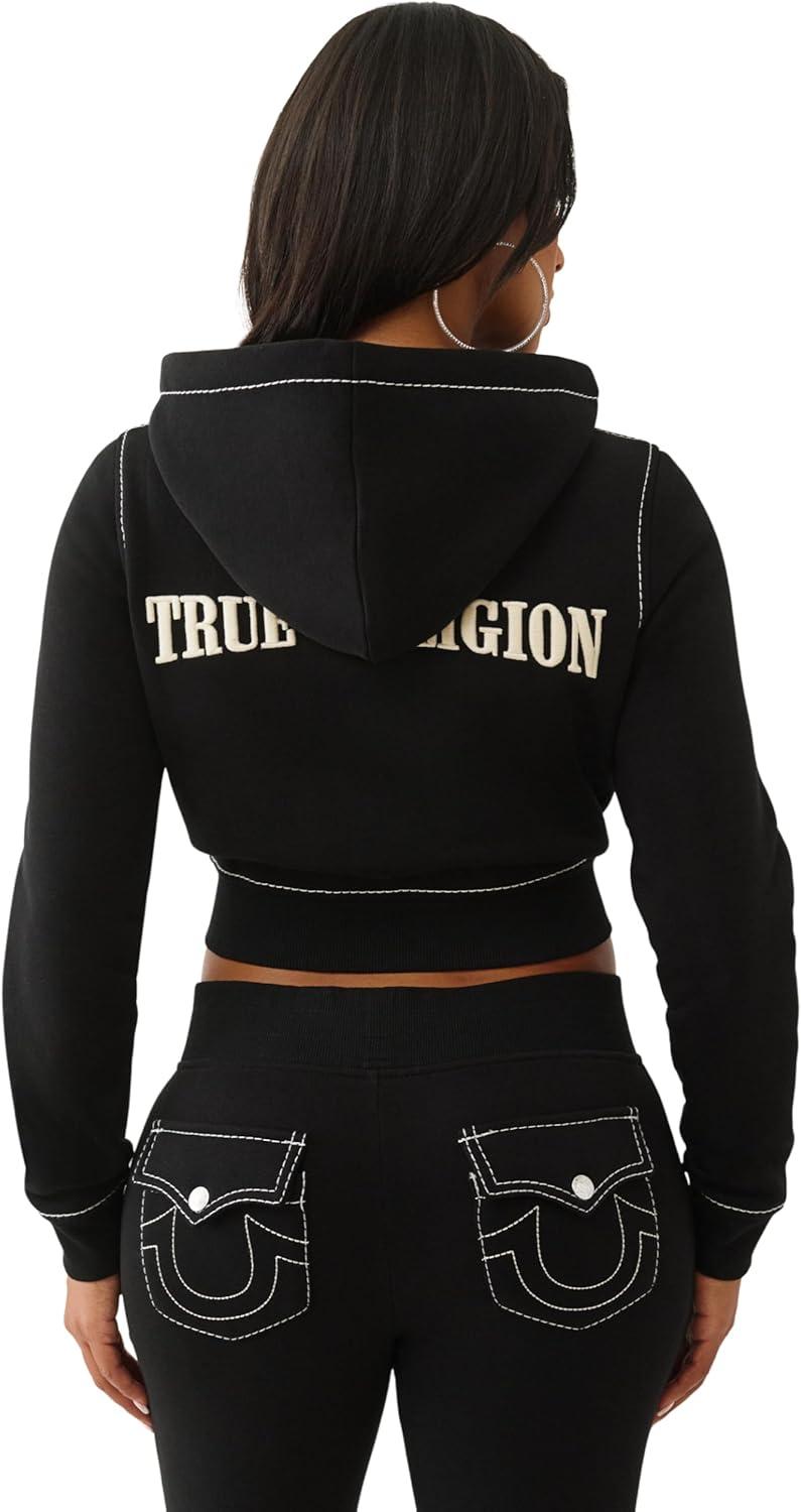 True Religion Shrunken Women’s Cropped Zip Up Hoodie – Big T Stitching & Iconic Horseshoe Logo(Jet Black)