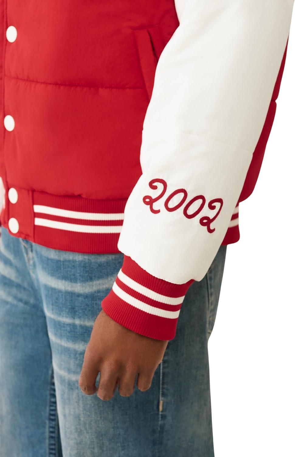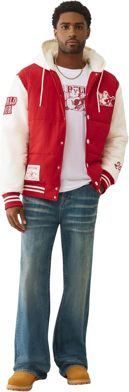 True Religion Varsity Hooded Puffer Jacket for Men – Warm Lightweight Winter Outerwear with Logo Patches(Tr-v Red / Winter White)