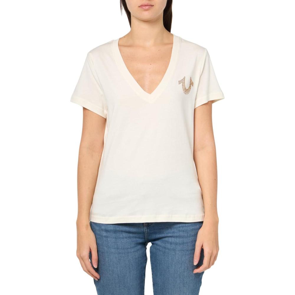 True Religion Women’s Crystal High Shine V-Neck Tee – Embellished Casual T-Shirt(Winter White)