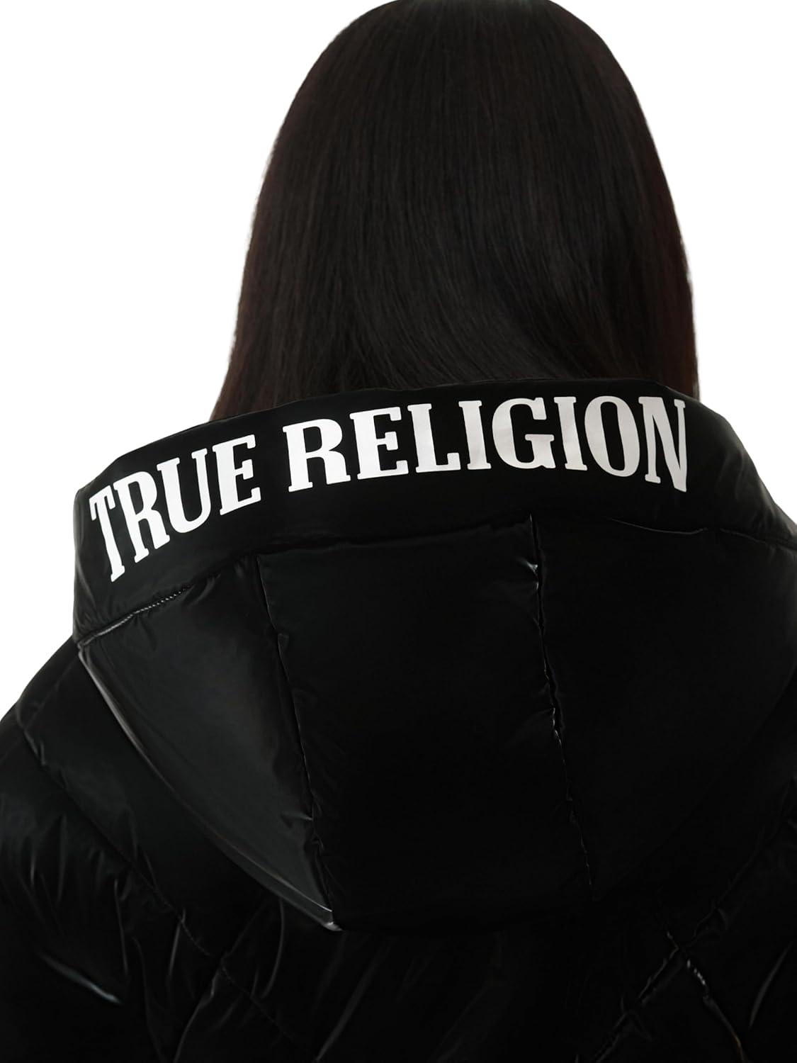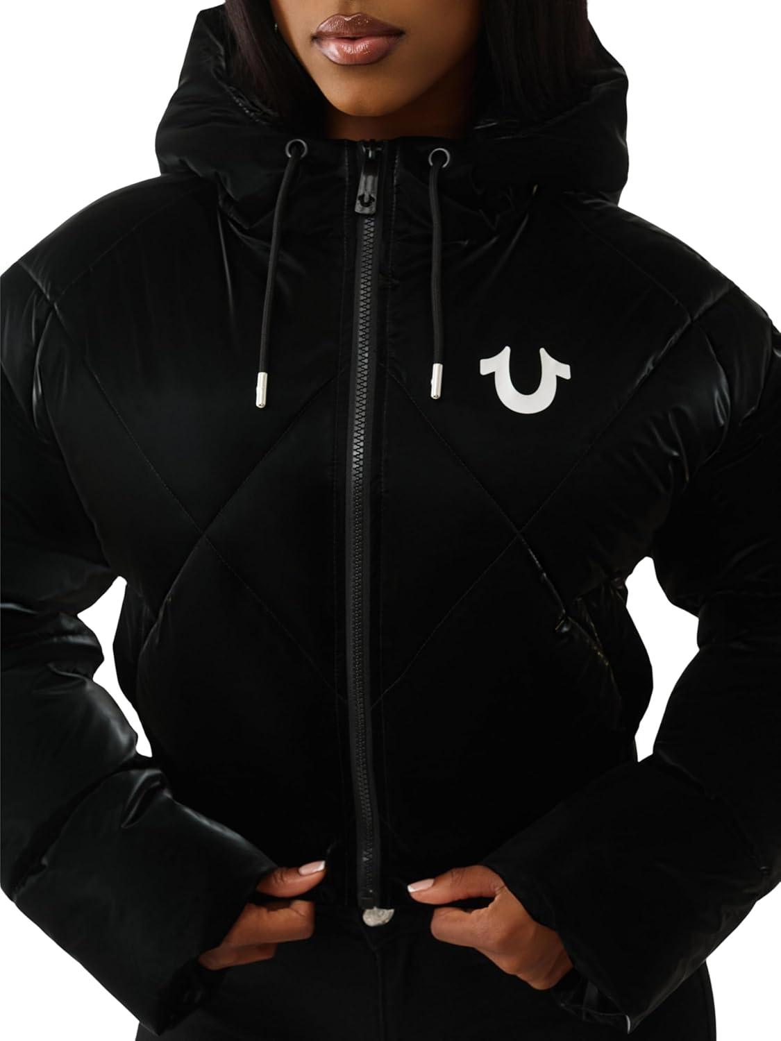 True Religion Women’s High Shine Foil Hooded Puffer – Lightweight & Comfortable Winter Jacket(Jet Black)