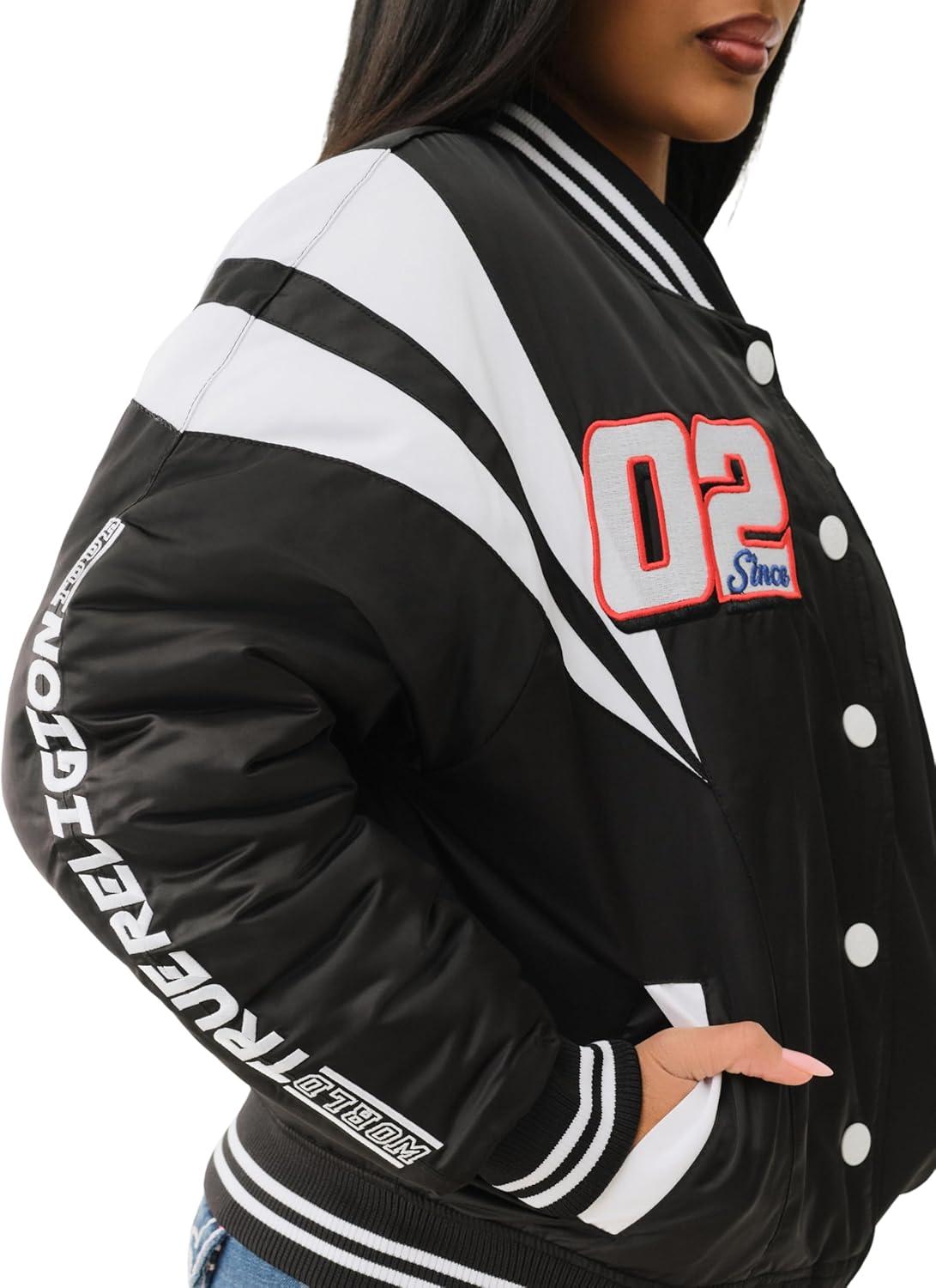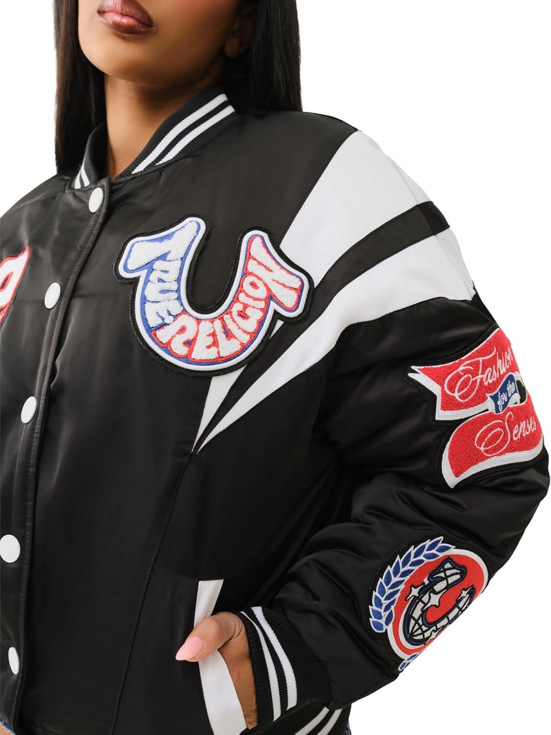 True Religion Women's TR Satin Oversized Varsity Bomber Jacket in Jet Black. This oversized bomber jacket features a sleek satin finish that gives it a luxurious, polished look while maintaining that classic varsity style. The zip-up closure allows for easy layering, while the ribbed cuffs and collar add to the athletic-inspired design and ensure a comfortable, snug fit.