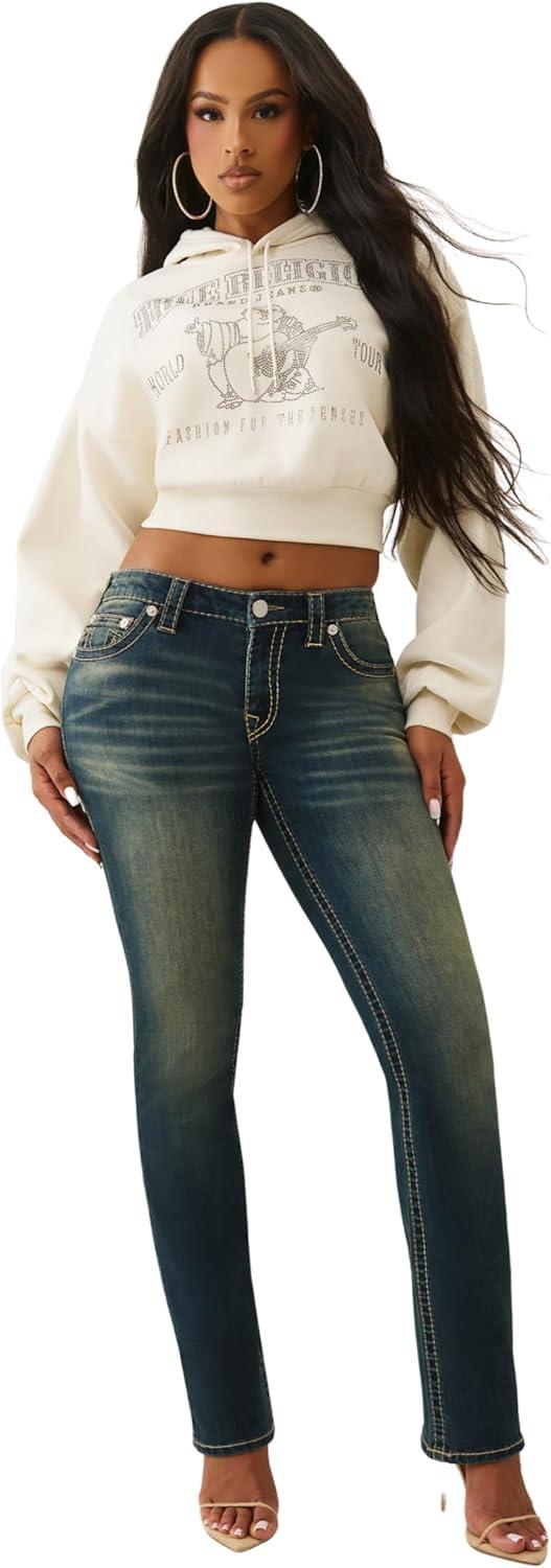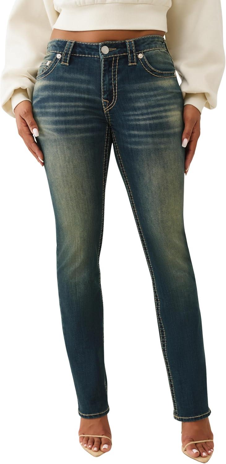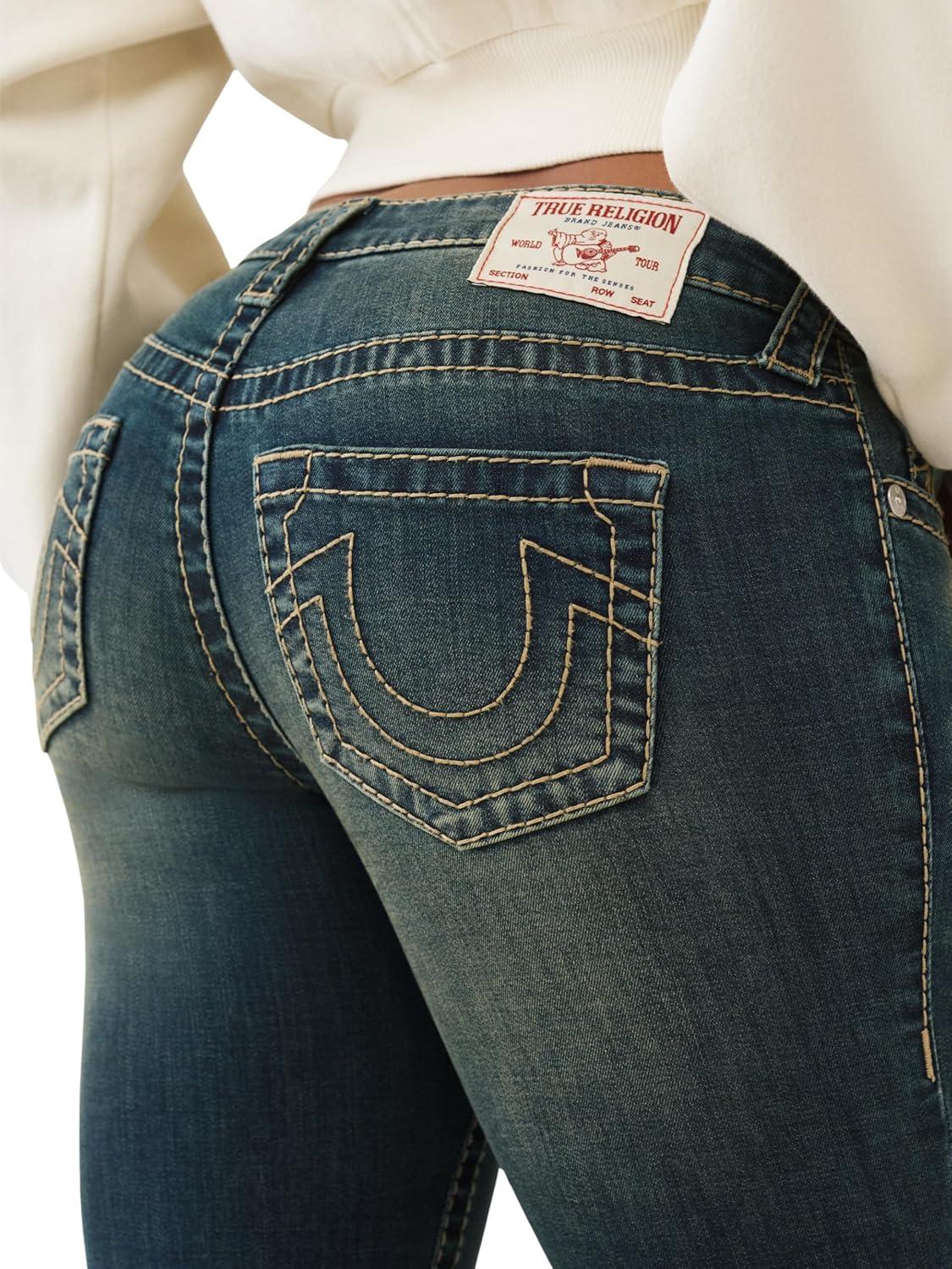 True Religion women's Halle Super Skinny fit jean fits like a legging and flatters all figures. This mid rise is built to hug you at every curve, smooth you at the waist and hip, and streamline your silhouette. Sits comfortably below the waist, cut skinny from thigh to hem.