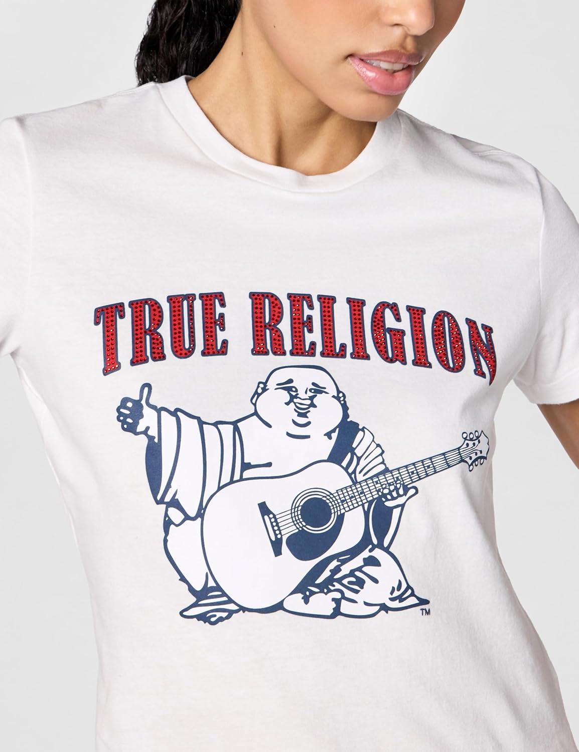 True Religion Women’s Wing Crystal Baby Tee – Cropped Cotton Blend Top, Short Sleeve, Crystal Logo | Crew Neck