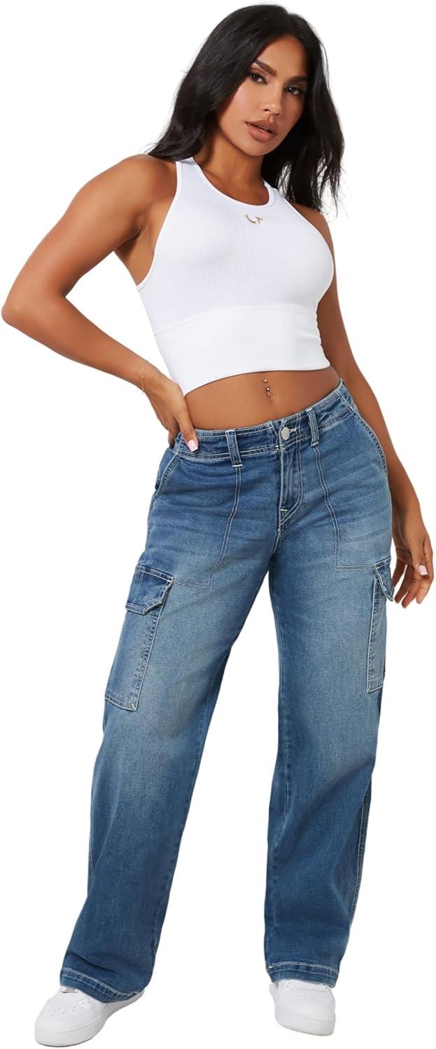True Religion Bobbi Baggy Jeans | Women’s Wide Leg Denim with Distressed Hem, & Flap Pockets